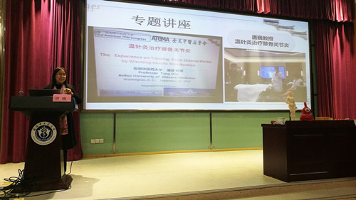 唐巍院长开展了主题为"针灸医学在美国的现状与发展――2017年第三届美国中医药大会参会体会"的专题讲座。她向在座师生分享了她参加第三届美国中医药大会的所见所闻;同时详细介绍了国际上中医药发展现状与建设、服务对象和医疗保险、中医针灸行业组织、中医针灸立法国家、中医药研究现状等情况,鼓励同学们坚定专业自信。
