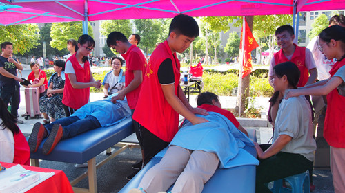 在迎新志愿者的引导下,新生和家长陆续到达学院报到点,迎新工作如火如荼,到处都是忙碌的身影。志愿者们满腔热情,帮新生家长们搬运行李,让刚踏入大学校园的新生们感受到了家一样的温暖。为了真正做到让学生满意,家长放心,学院采取了一系列有效措施,为节省新生报道和领取材料时间,在迎新前,对所有新生的宿舍钥匙、饭卡、水卡、学生手册等材料都提前制作了个人档案袋,一站式领取;为让新生提前了解中医文化,迎新志愿者立足于专业特色,在家长休息室开展了推拿、拔罐等治疗,在报到点旁进行了五禽戏表演、针灸文化长廊展示。