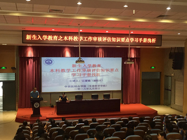 为深入贯彻“以评促建、以评促改、以评促管、评建结合、重在建设”的评建工作方针,进一步营造良好评建氛围,使2018级新生尽快了解并融入学校的审核评估工作,中西医结合学院结合新生入学教育,于9月4日在教学楼A114开展本科教学工作审核评估知识宣讲活动,宣讲报告会邀请学院副院长江爱娟主讲。