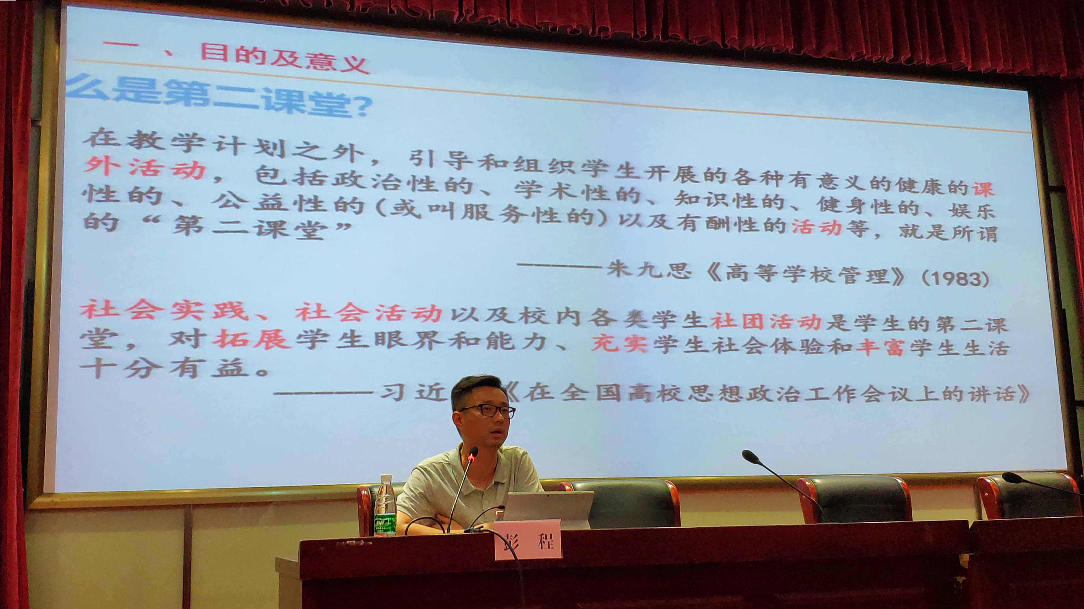 彭程主任的讲座从第二课堂的开展目的及意义、具体实施办法和目前开展情况等方面,高屋建瓴地为新生讲授什么是第二课堂。通过彭程主任的讲解,新生们了解了第二课堂学分类别分为道德修养类、社会实践类、专业综合类、科技创新类、文体艺术类、社团活动类、技能考证类等七类,涵盖了大学生成长所需的关键内容。