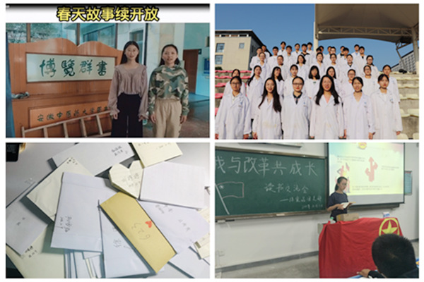 采取主题班会等集中学习和自学相结合的方式,,组织团员深入学习改革开放40年历史进程和党的十九大胜利召开后,新时代改革开放进行时的新形势、新格局。鼓励药学院青年团员主动地在线上学习、交流、讨论改革开放内容和精神内涵。药学院各班级团支部在各班班级辅导员和团支部书记的组织下,开展了“我与改革共成长”支主题班会活动,这是各班级学习系列活动的重要组成部分。通过主题班会的召开,各团支部成员能够将改革开放的核心精神内涵内化于心,同时提高了各班级团支部的凝聚力和向心力,进一步培养药学院学生的爱国情怀和责任担当。