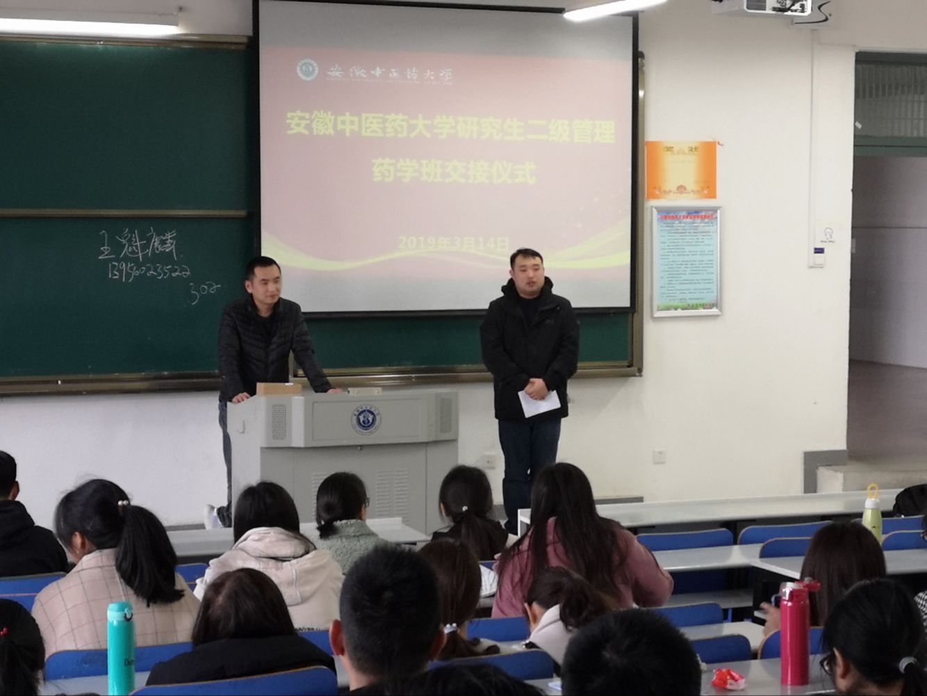 2019年3月14日,2018级硕士研究生药学班二级管理交接仪式在教学楼A205教室正式举行,研究生院辅导员张瑀老师为2018级研究生药学班同学上了最后一堂班会课,并正式将班级管理工作交接给药学院辅导员王魁麟老师。此次班级工作交接标志着我校研究生二级管理进入正式实施阶段。
