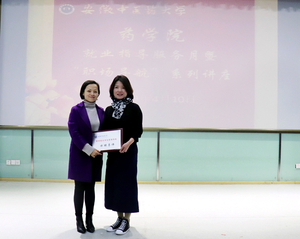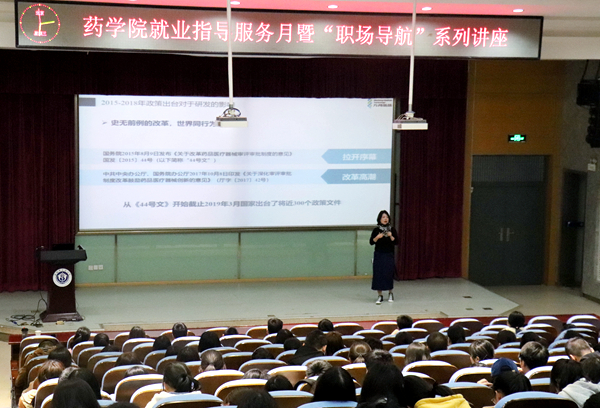 为进一步提高就业服务质量,帮助学生梳理正确的就业观,提高就业能力。4月11日晚6,药学院在A114报告厅举办就业指导服务月暨“职场导航”系列讲座。首场讲座邀请安徽万邦医药科技有限公司董事长、医药经济管理学院陶春蕾老师作主题为《政策频出重塑医药行业格局》的专题讲座。药学院党委副书记金晓琴主持讲座,部分专业课教师、全体辅导员和400余名在校生聆听了此次报告。
