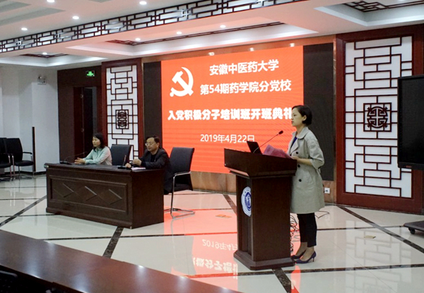 4月22日下午,药学院在沁馨堂举办了分党校第54期入党积极分子培训班开班典礼。药学院党委书记吴达武,院长桂双英出席了本次开班典礼,典礼由药学院党委副书记金晓琴主持,各学生党支部书记、全体学员们参加了此次典礼。