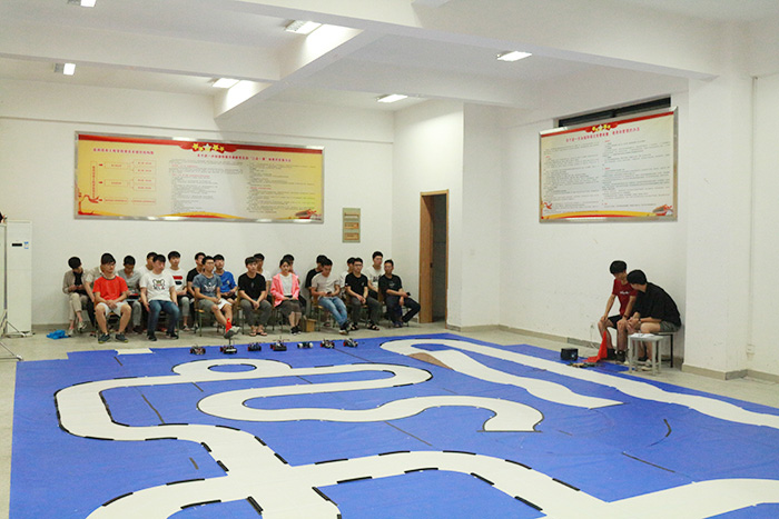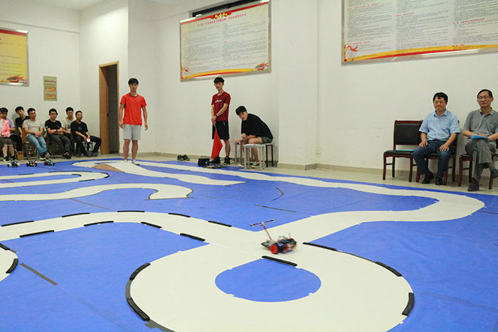 竞赛评委组金力宣读了比赛规则。比赛正式开始,一辆辆智能车在赛道上加速冲刺、自动辨别方向、巧妙过弯的画面,让老师和同学们大呼过瘾,现场高潮迭起。最终,赵玄代表队以单圈17.7秒用时的优异成绩夺魁。