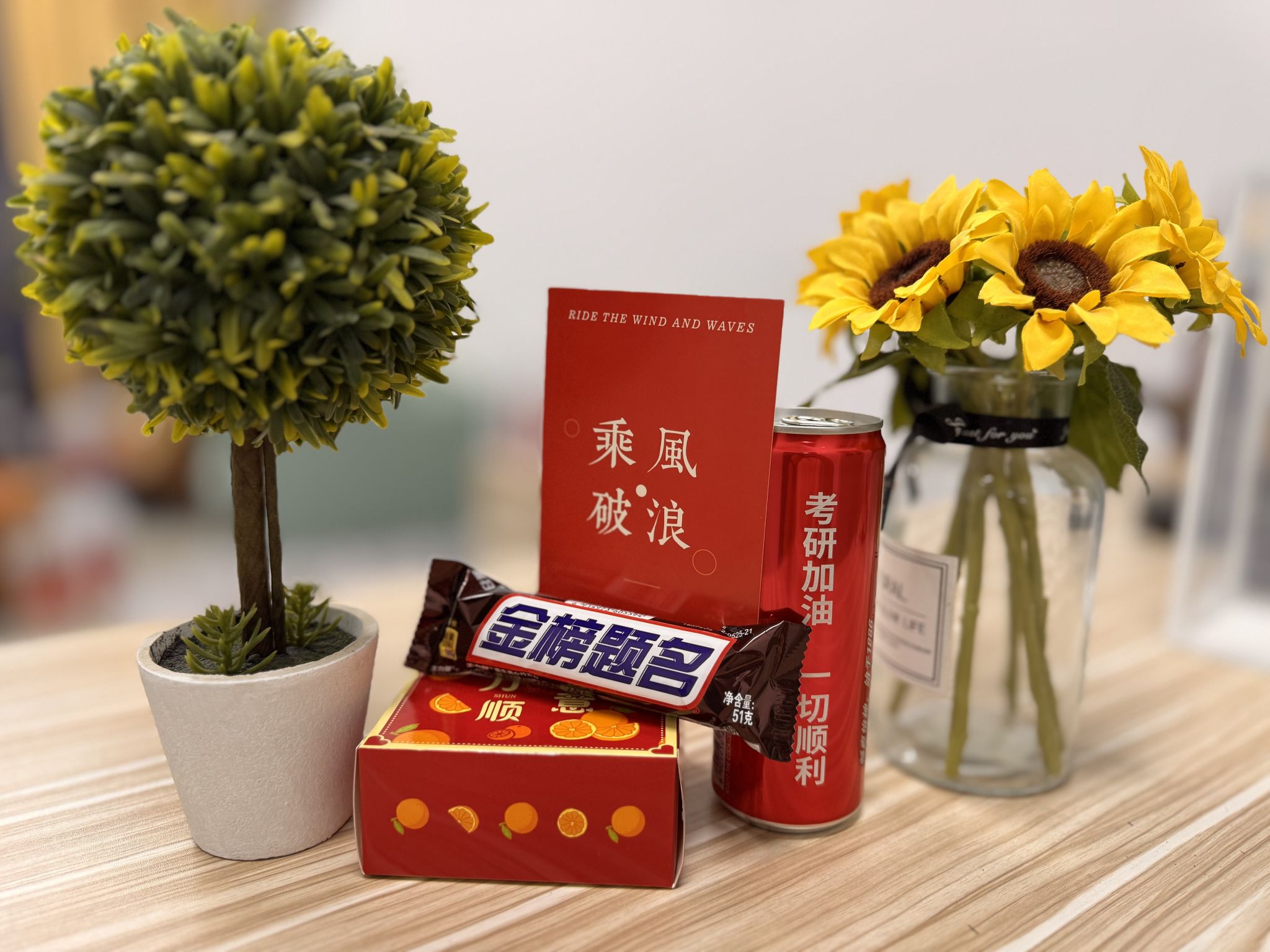 从“金榜题名”士力架、“万事顺意”糖果、“好柿花生”饼干,到祝愿“考研加油,一切顺利”的可口可乐,再到学弟学妹们撰写的“乘风破浪”“前程似锦”祝福贺卡,每个礼物都蕴含着美好的寓意,不仅传递了学院对考研学子的深深期望与殷切祝福,更为他们的考研之路增添了一份温情。