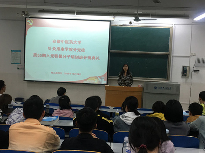 为进一步提高入党积极分子的政治理论素质,增强青年大学生的爰国情和爰校情,针灸推拿学院分党校举办第55期入党积极分子暨学习党的十九大精神培训班,开班典礼分别于10月29日晚、10月30日晚在少荃湖校区、梅山路校区召开。针灸推拿学院党委书记尹必武、院长唐巍、本期培训班班主任李海燕及136名学员参加了开班典礼。