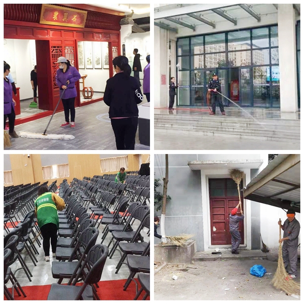 坚守岗位,保持环境清洁。组织后勤工作人员认真做好教学楼出入秩序维护工作及周边环境保洁、自行车整理摆放工作;组织工作人员在学校各主干道路、重要景点、校庆活动会场进行循环保洁作业,及时清空垃圾箱垃圾,随时维护场地卫生。