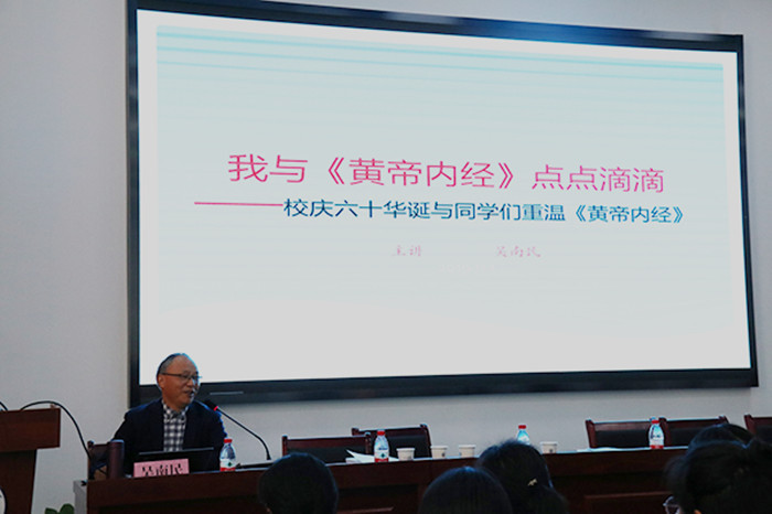 吴南民教授带来了以“我与《黄帝内经》的点点滴滴——校庆六十华诞与同学们一起走进第一经典”为主题的讲座,他从学《内经》、讲《内经》、用《内经》等方面切身阐述了与《内经》的不解之缘与深刻感受。强调学习中医寻本源,不忘初心的重要性,告诫中医学子应遵循医道、敬畏天地、段本求枝、溯流讨源。