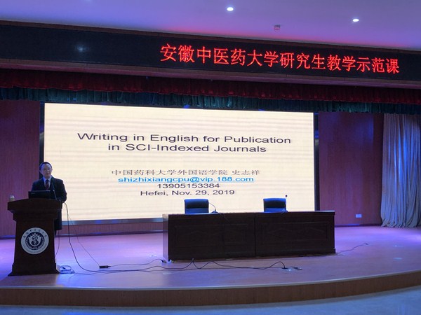 为切实提升我校研究生课程教学水平,近日,学校研究生院和教学评价与教师发展中心在图书馆学术报告厅开展研究生教学示范课活动,活动特邀中国药科大学外国语学院副院长史志祥教授为全校各年级近200位研究生进行授课。我校从事研究生英语教学人员和部分骨干教师培训学员到场观摩。