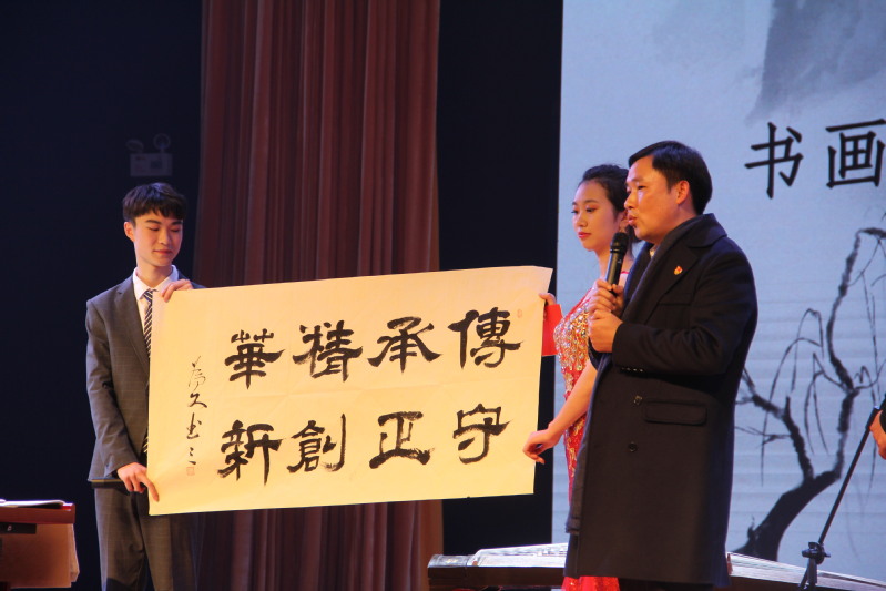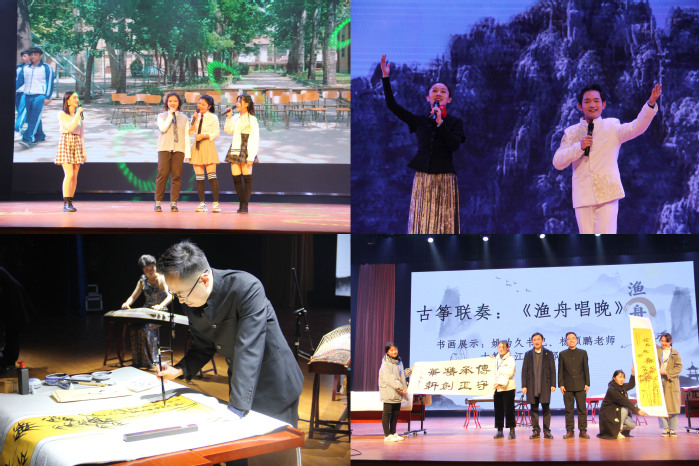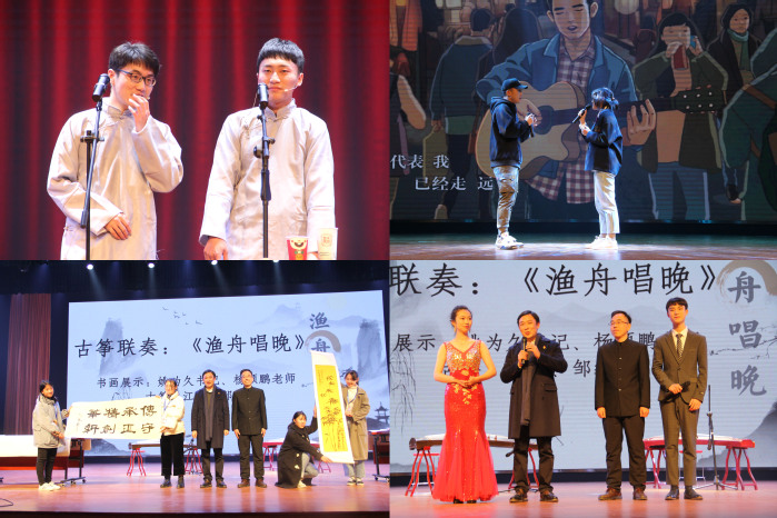 乐起舞动,晚会在激情四射的开场舞《Rumor》中拉开帷幕。手影舞《光影祝福》化影成蝶,此时无声胜有声;歌曲《等你下课》宛转悠扬;语言类节目《推销》,轻松愉悦;《我们也曾是少年》告诉我们少年的肩应该担起草长莺飞和清风明月;辅导员王满老师的《十年》唱出了对人文学子关切;优美汉舞《盛世》使我沉醉,锦绣河山使我自豪;一叶轻船,一双人倚揽,一曲《烟雨行舟+故人叹》惹人醉;《磨店四大才子》中王府的比武招亲,让我们懂得颜值不是正义,有趣灵魂万里挑一。GZW舞团炫酷的街舞表演《Keeping on dancing》燃爆现场;相声《幸福是什么》包袱重重,精彩连连,台下笑声不绝;两位同学的葫芦丝傣舞表演《月亮》古典与现实交相辉映,民俗与现代相得益彰;李菁菁老师与胡佳凡同学的美声戏曲联唱《天下黄山》高亢嘹亮,意蕴悠长;创意节目古筝联奏《渔舟唱晚》更是独具风采,筝声婉转中,姚为久书记与杨硕鹏老师笔墨横姿,下笔如有神。姚为久表达了对174名人文新学子的热烈欢迎,并教导同学们传承精华,守正创新,在人文与国际教育交流学院乘风破浪,展翅翱翔。