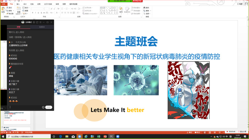 16级药剂班辅导员任亚硕以“疫情之下,就业加压,毕业生何去何从”为主题,与同学们分析了疫情下的就业形势,鼓励学生调整心态,积极转变就业观念,把握好就业机会,增强竞争意识,做好服务基层的准备,踏实做好求职工作。17级药学班辅导员王魁麟结合本专业实际,以“医药健康专业学生视角下的新冠肺炎疫情的防控”为主题,从疫情认知到自我防护,从遵守防控职责到积极调整心态等方面入手,提高了同学们战胜疫情的信心。19级中药班辅导员汪媛以“停课不停学”为主题,督促学生积极利用网络资源进行学习,引导学生按时参加线上教学直播课程,利用假期充实自我。