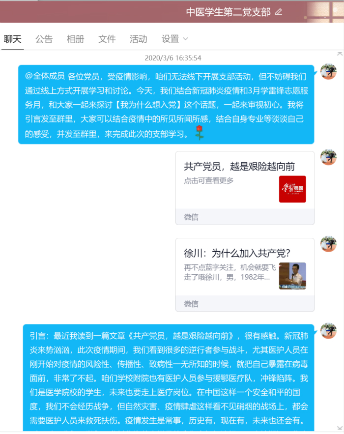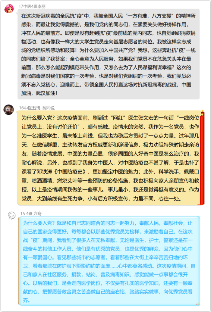 疫情阻断了师生们面对面交流,却阻碍不了大家参与支部活动的热情。QQ群里,大家畅所欲言,有的被疫情期间中国共产党领导和团结全国人民同心抗“疫”的治理能力所震撼,有的被共产党员逆行而上、积极投身疫情防控工作的勇气所打动。学生党员们纷纷表示,作为一名医学生,应扎实学业知识、练就过硬本领、培养大爱情怀,才能在日后国家和人民需要的时候,招能来、来能战、战能胜!