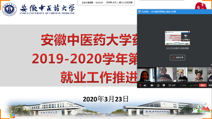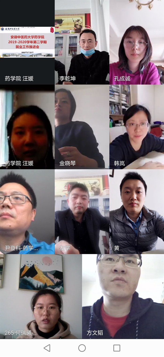 为贯彻落实省教育厅和学校对于疫情期间的就业工作指导精神,最大程度降低疫情对毕业生就业工作的影响,保障顺利完成2020届毕业生就业工作目标。3月23日,药学院召开2020届毕业生就业工作网络推进会,学生处副处长金晓琴、学院党政领导、亳州职业技术学院药学院院长刘耀武、全体毕业班辅导员和就业工作秘书汪媛参加会议,会议由汪媛主持。