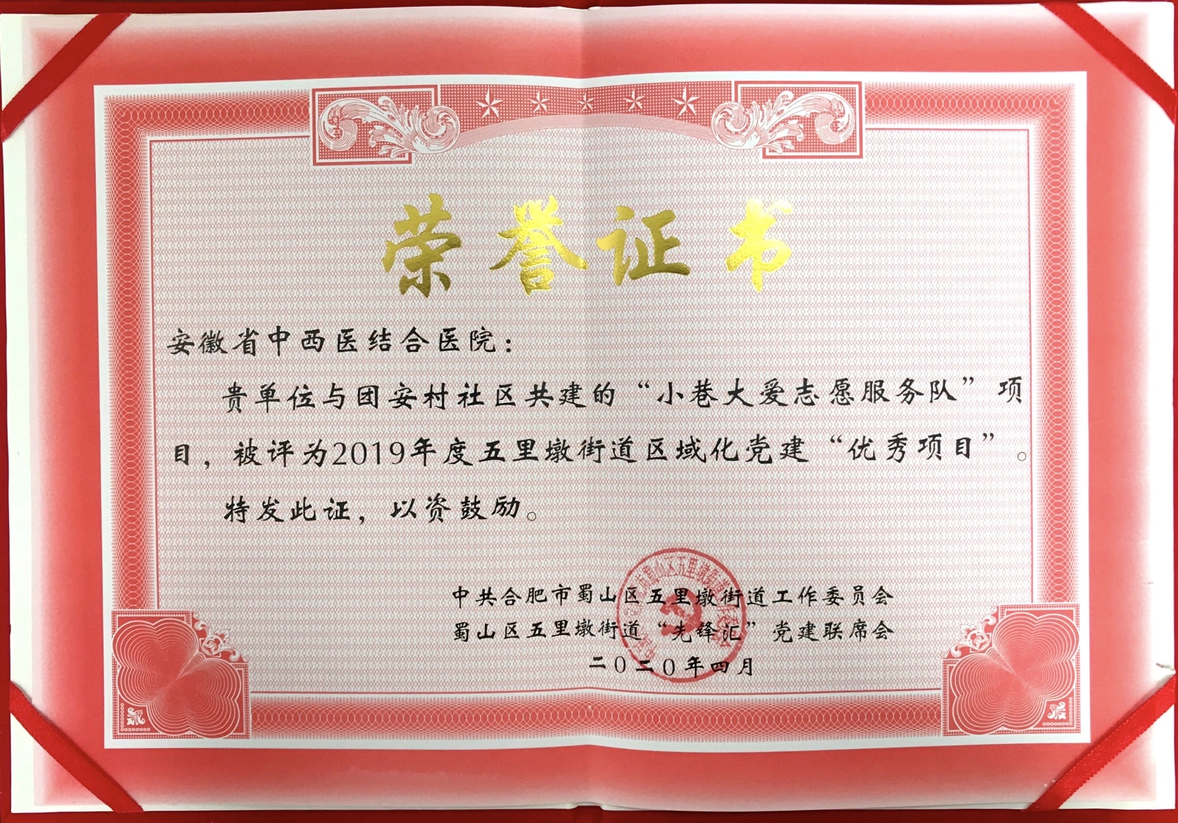 4月30日上午,五里墩街道辖区举办“先锋汇”党建联席会区域化党建优秀项目评选活动。学校第三附属医院与团安村社区共建的“小巷大爱志愿服务队”项目,被评为2019年度五里墩街道区域化党建“优秀项目”。