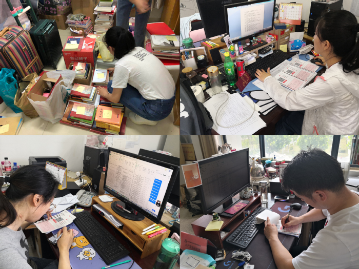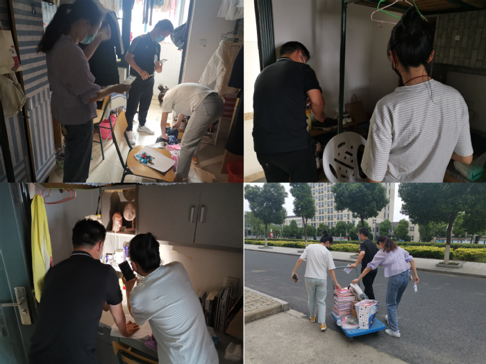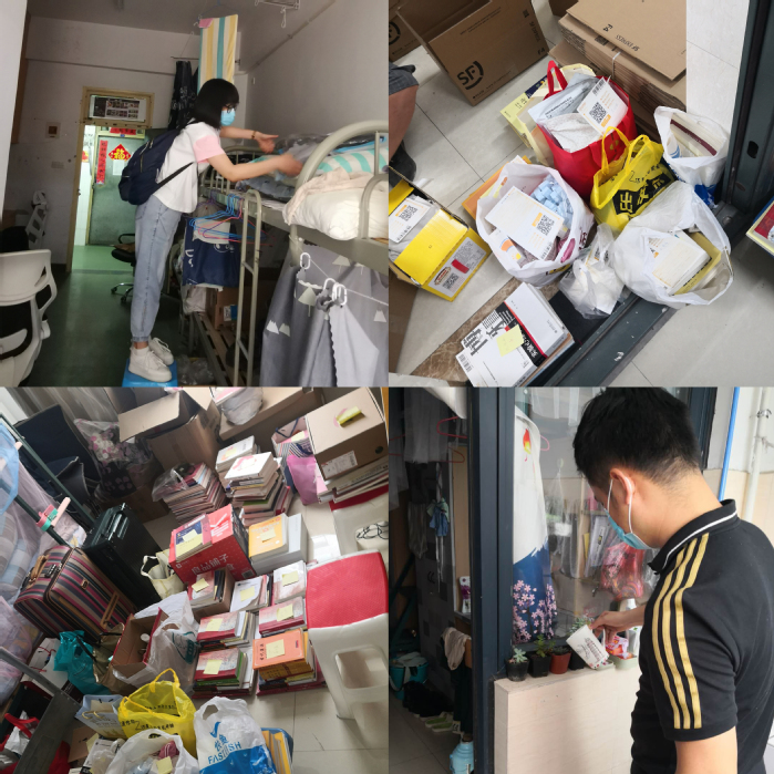 截止目前,人文与国际教育交流学院共计走访近80间宿舍,服务近150人次,快递包裹113件。几天时间,辅导员们走完了学校的每一栋宿舍楼,爬了无数次的一楼到18楼,一间间地开门、视频电话、寻找物品、检查被褥、给植物浇水、扔掉过期食物、整理丢弃垃圾、检查门窗水电、一张一张填写快递单、一个一个打包、一车一车将打包好的书籍衣物送到快递点、一件件物品通过顺丰快递方式交给学生,既解决了学生线上学习之需又及时有效地排查并解决了各种隐患。