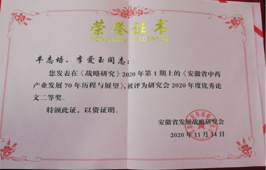 年会为优秀论文颁奖,丰志培、李爱玉撰写的《安徽省中药产业发展70年历程与展望》荣获安徽省发展战略研究会2020年度优秀论文二等奖。