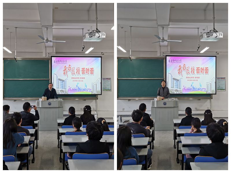 第三个环节为我与教授面对面:学校教学督导、安徽省中医药科学院药物化学研究所所长李家明教授以问题“你准备好来读大学吗?”让同学们思考来读大学的目的以及未来的规划,不要被智能手机所左右,药学院的老师们会“甘为人梯”尽自己最大的努力帮助同学们成长成才,建议同学们开展晨跑、晨读、小组分享学习心得感悟等多种形式共同提高,营造积极向上,乐于学习,勤于思考,健康生活的氛围。药学院药化系主任李传润教授要求大家不要荒废自己,鼓励同学们好好地规划自己的大学生活,创造属于自己的未来,学校将让同学们的人生获得更大增值。