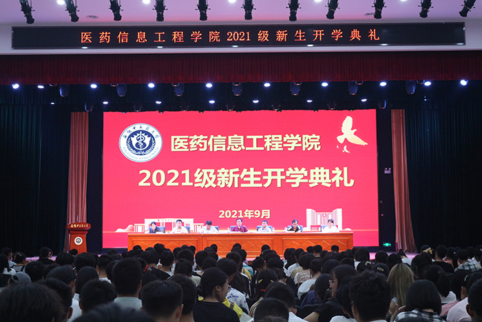 9月27日下午,医药信息工程学院举行2021级新生开学典礼。学院党委书记吴成海、院长阚红星,学院党政领导班子,部分教师、新生班辅导员以及2021级全体新生参加典礼。