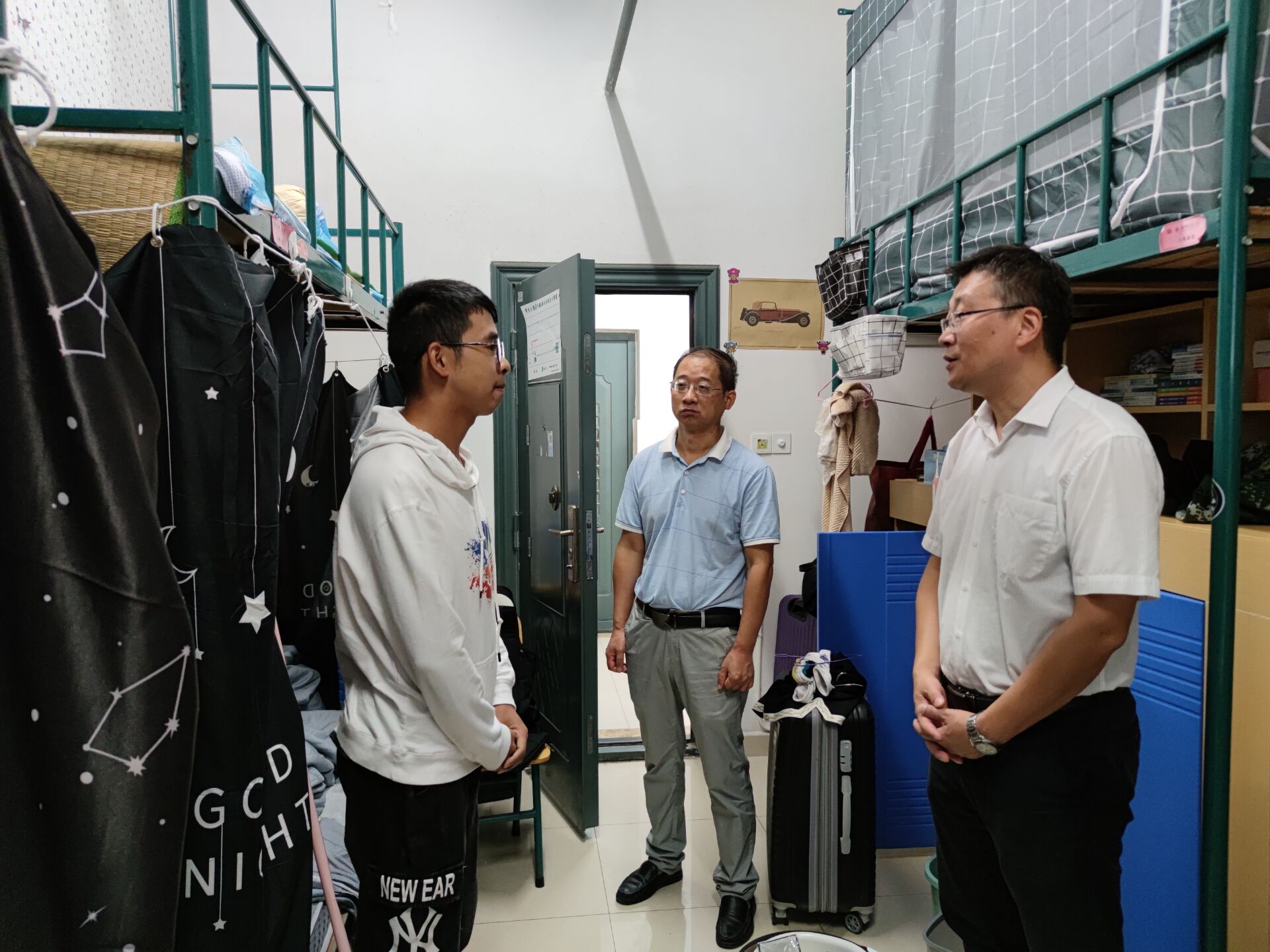 走访过程中,冯鑫与学生进行亲切交谈,询问学生们国庆假期的安排,叮嘱假期出行学生注意途中安全和疫情防护,强调宿舍的水电安全,希望同学们平时多看书、多学习,希望他们树立“先就业,后择业”的观念,并表示相信他们肯定会有所作为。
