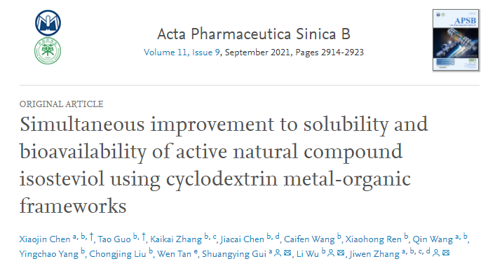 Chen Xiaojin,Guo Tao,Zhang Kaikai,Chen Jiacai,Wang Caifen,Ren Xiaohong,Wang Qin,Yang Yingchao,Liu Chongjing,Tan Wen,Gui Shuangying,Wu Li,Zhang Jiwen. Simultaneous improvement to solubility and bioavailability of active natural compound isosteviol using cyclodextrin metal-organic frameworks[J]. Acta Pharmaceutica Sinica B,2021,11(9):