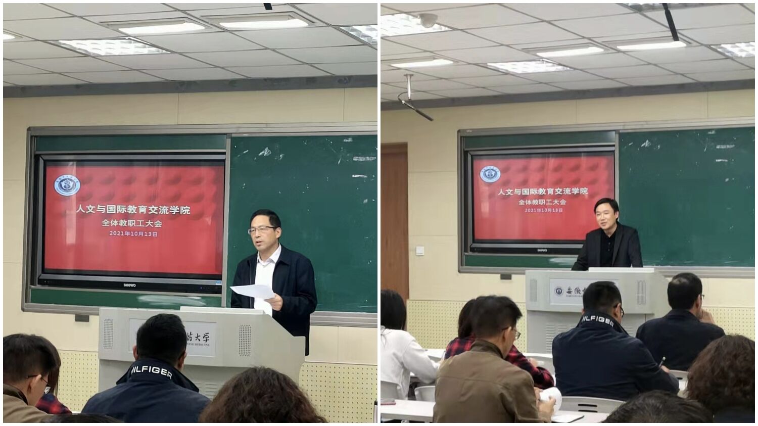 10月13日,人文与国际教育交流学院召开全体教职工大会。学院党政领导班子成员出席会议,全体教职工参加会议,会议由学院党总支书记姚为久主持。