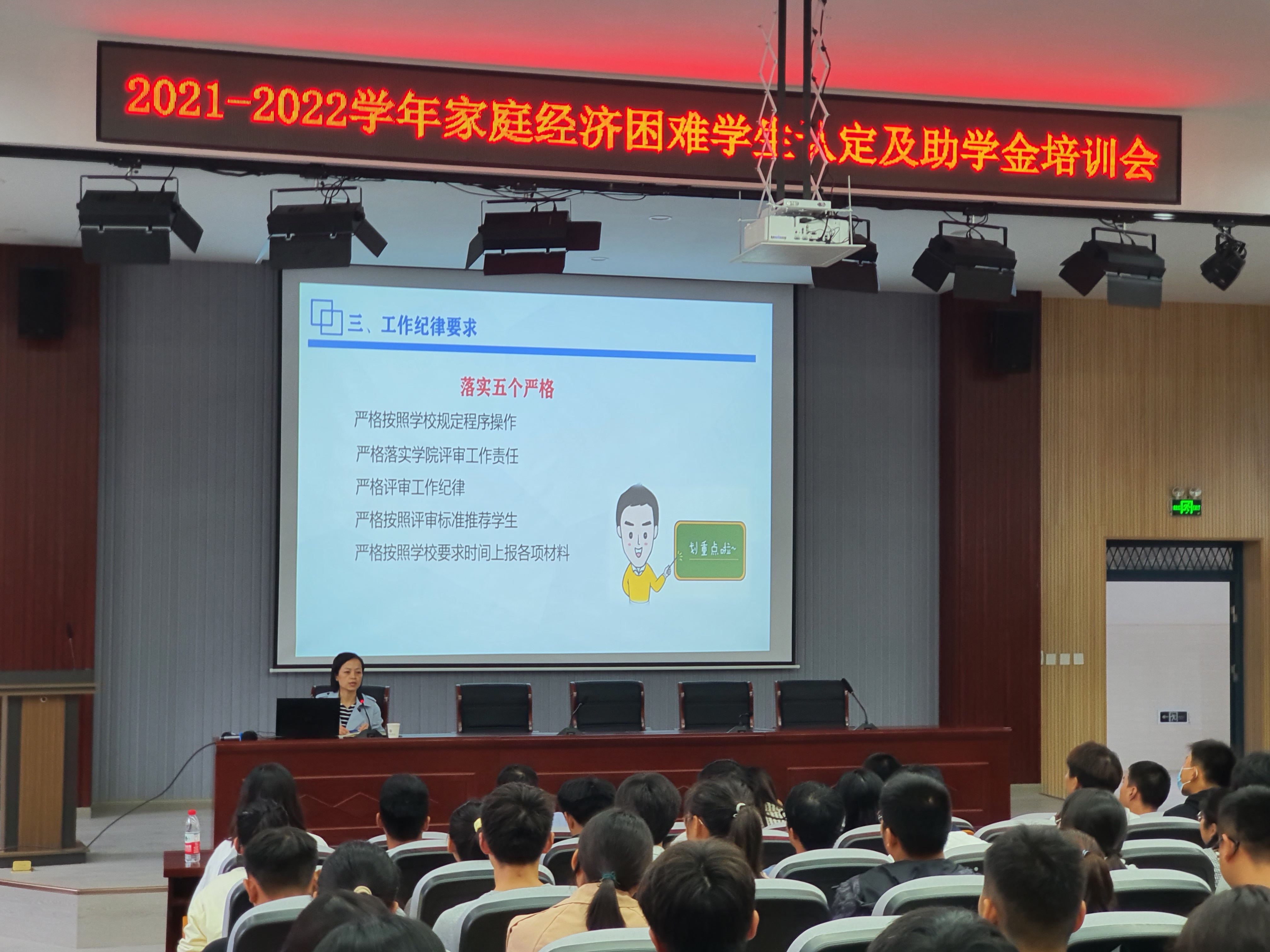 各学院学工办主任、2021年新入职辅导员、2021级班级辅导员和班长共100余人参加了培训。本次评审工作培训会的举办提高了各院学生资助工作人员对家庭经济困难学生认定、助学金政策要求和工作程序的理解和把握,为2021年家庭经济困难学生认定、助学金评审工作的顺利开展打下了坚实基础。