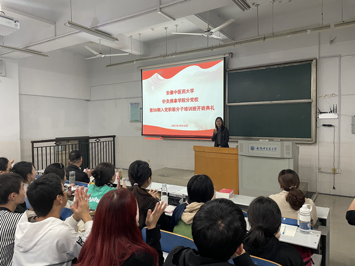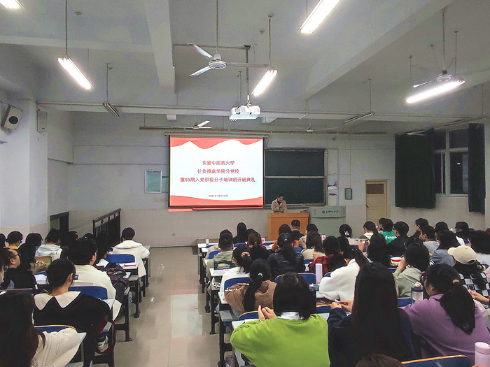 10月19日晚,针灸推拿学院党委在梅山路校区举行第59期入党积极分子暨青年马克思主义者培养工程培训班开班典礼,学院党委书记蒋宏杰、学院院长唐巍出席典礼,分党校班主任何莹列席。典礼由学院党委副书记李海燕主持。