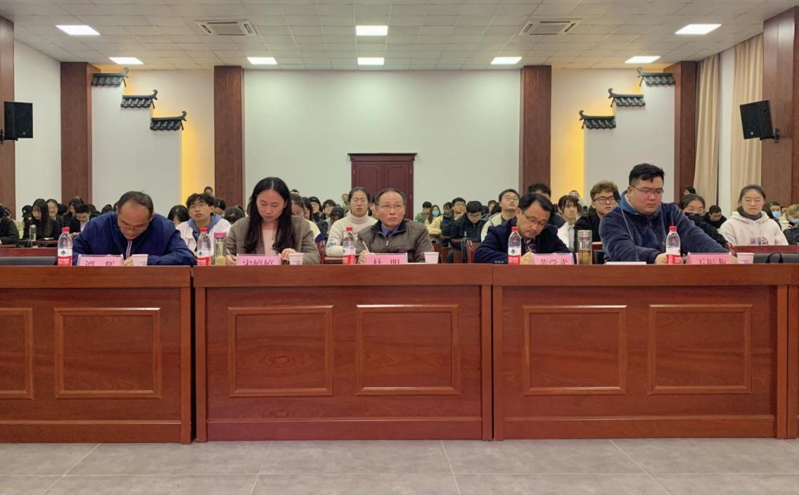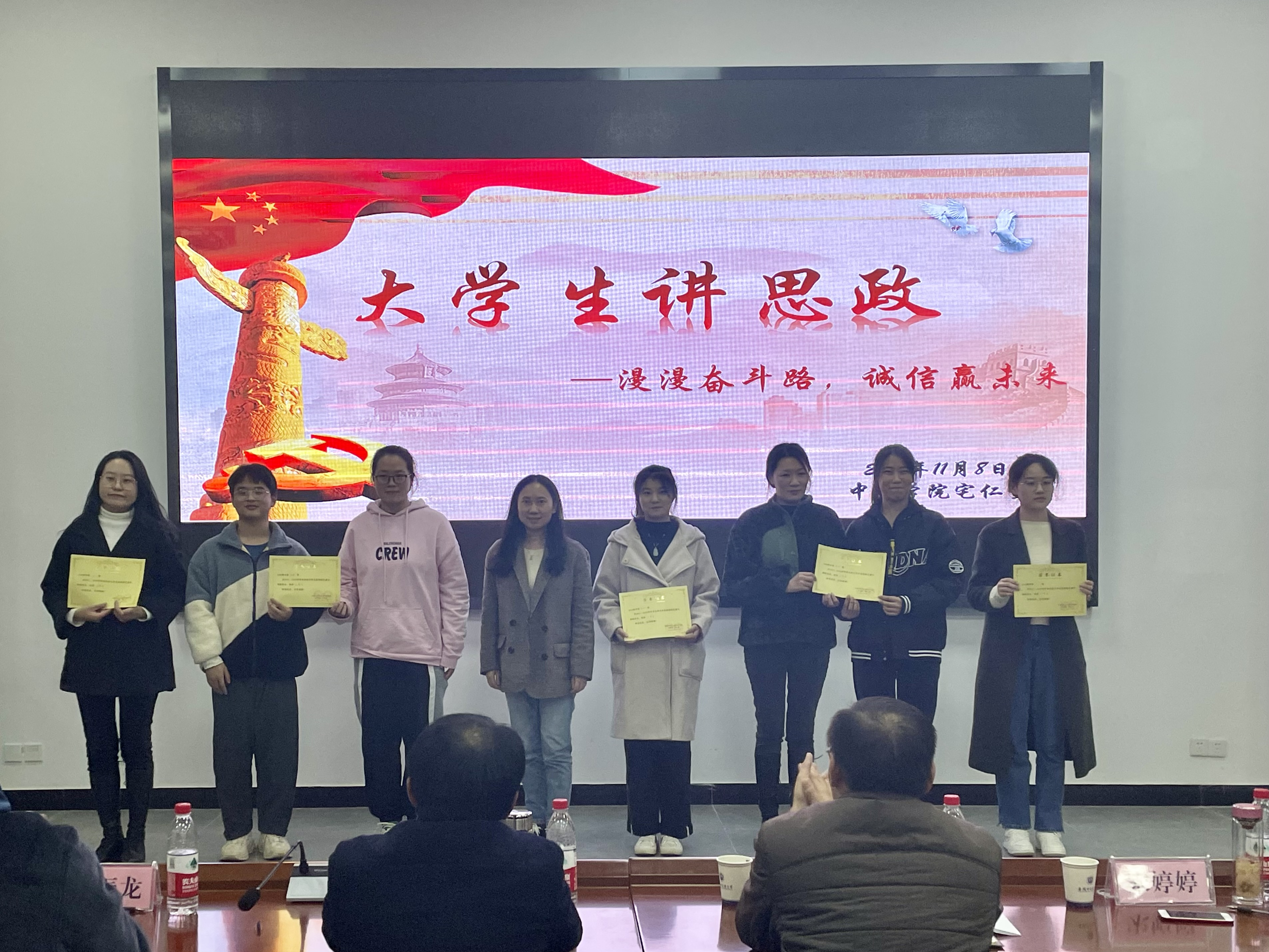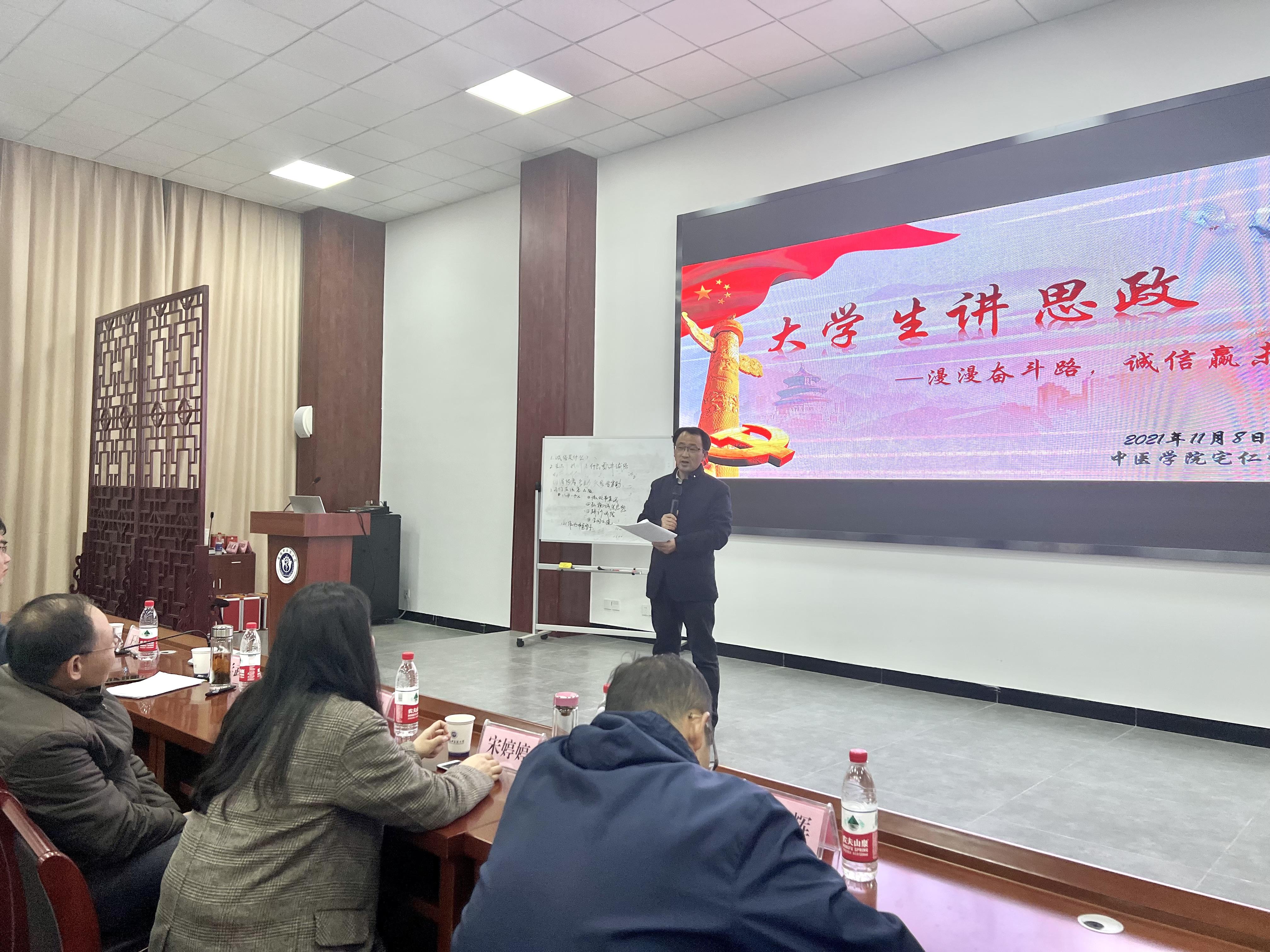 为引导大学生弘扬诚信精神,进一步发挥学生的学习积极性、主动性和创造性,11月8日晚,中医学院在宅仁堂举办第三届 “大学生讲思政”大赛院级选拔赛。中医学院党委书记杜明、马克思主义学院党总支书记黄学武、中医学院党委副书记宋婷婷、中医学院学科与科研办公室主任谭辉以及中医学院团委副书记王振龙担任了评委。