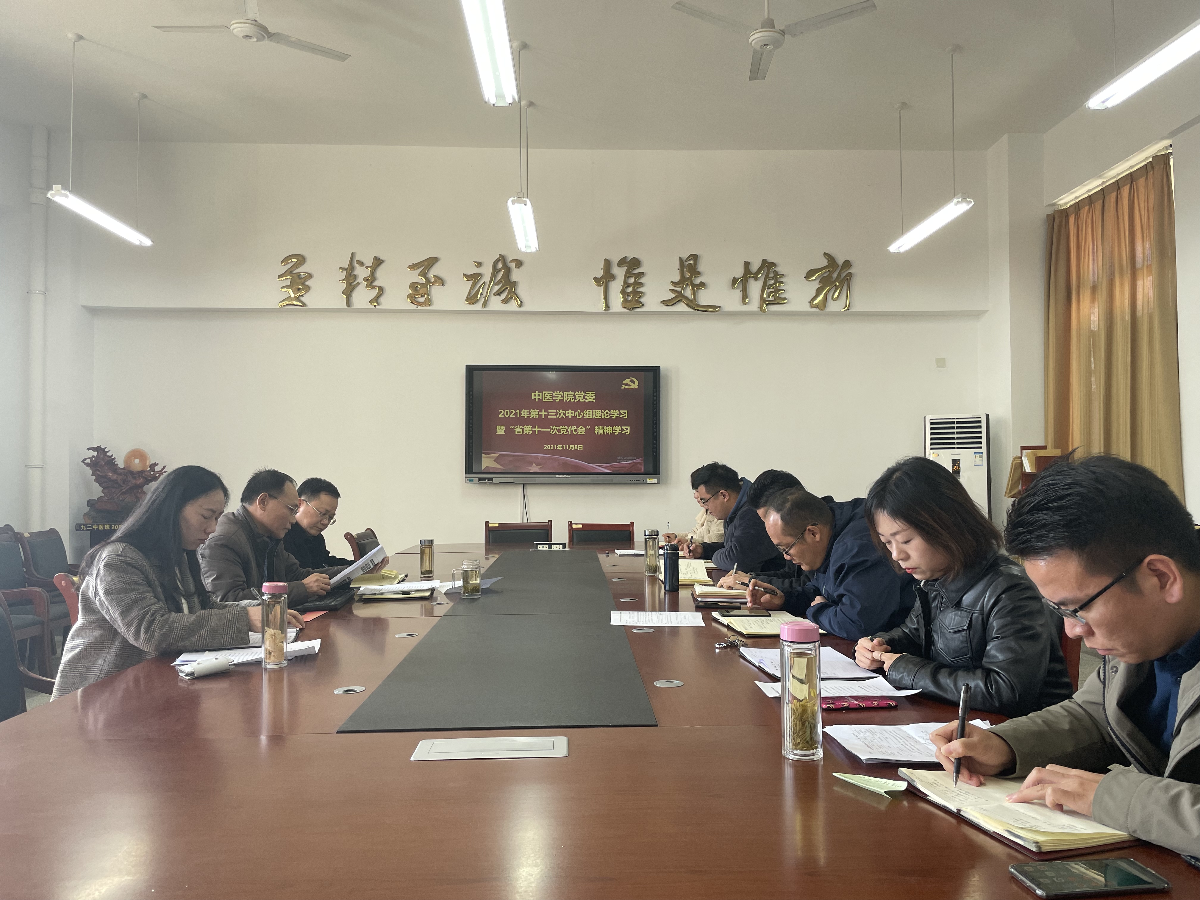 11月8日下午,中医学院党委召开2021年第十三次中心组理论学习会,学院党委中心组成员、各党支部书记参会,会议由学院党委书记杜明主持。会上,杜明带领大家专题学习了“中国共产党安徽省第十一次代表大会”会议精神。