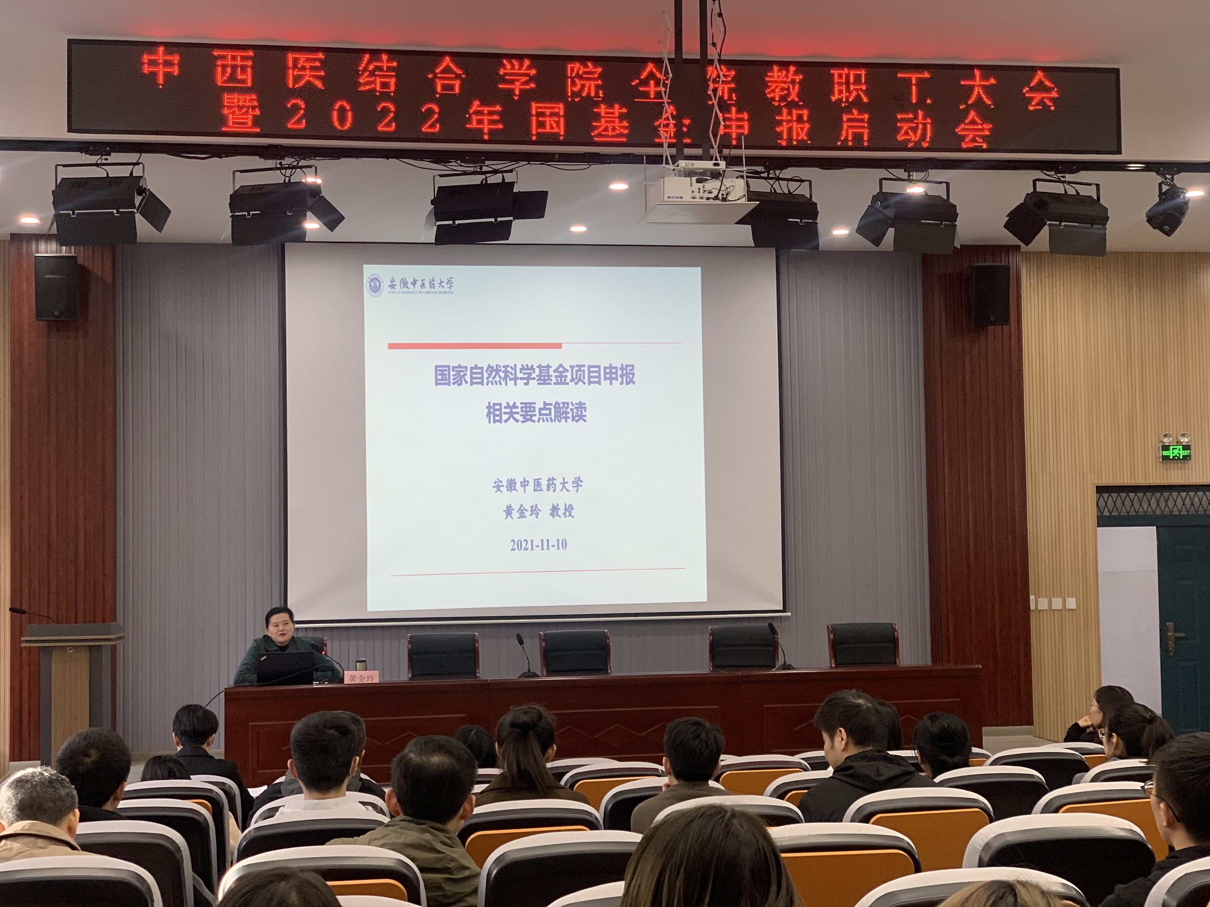 11月10日下午,中西医结合学院召开2022年国家自然科学基金申报启动会,特邀中西医结合研究所所长黄金玲教授作“国家自然科学基金项目申报相关要点解读”的学术报告。报告由中西医结合学院党委书记尹必武主持,学校教师及硕博士参加了本次学术交流活动。