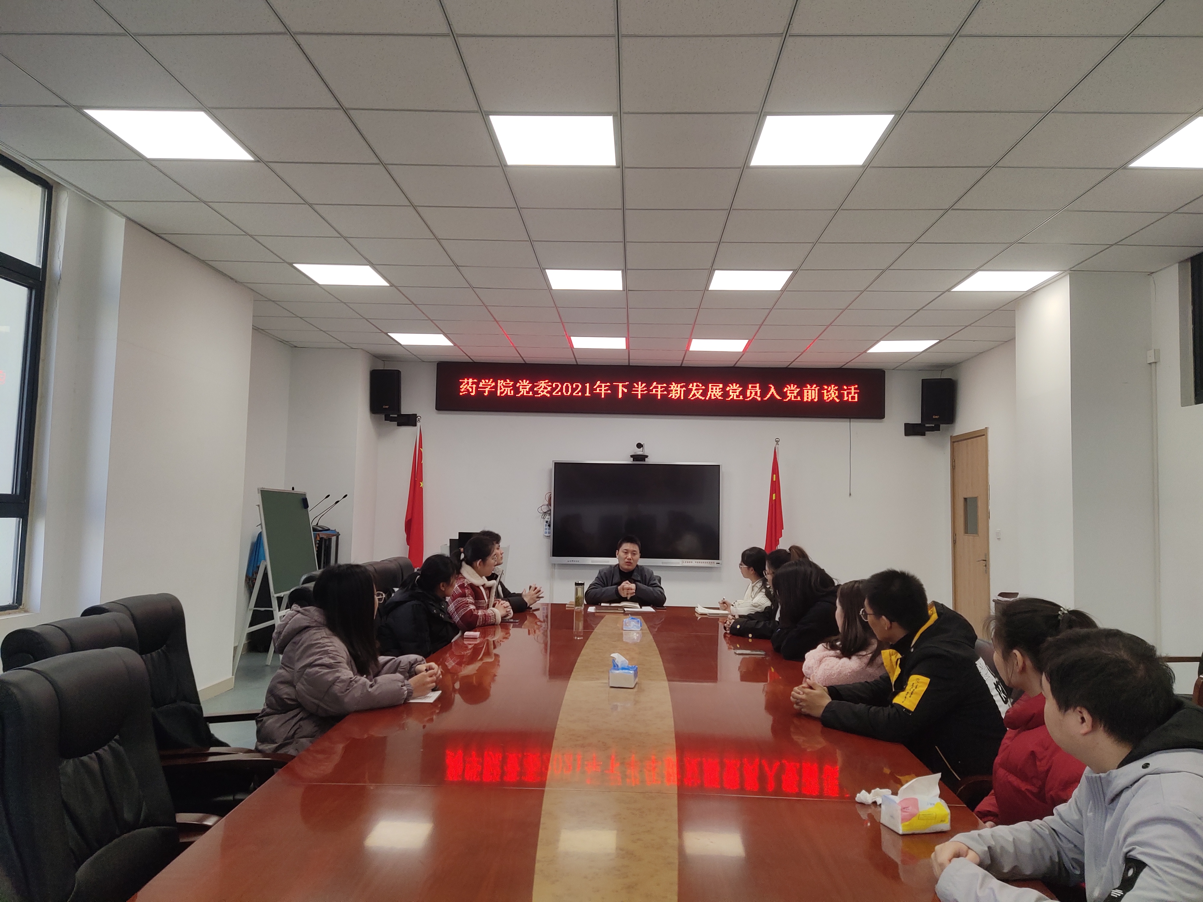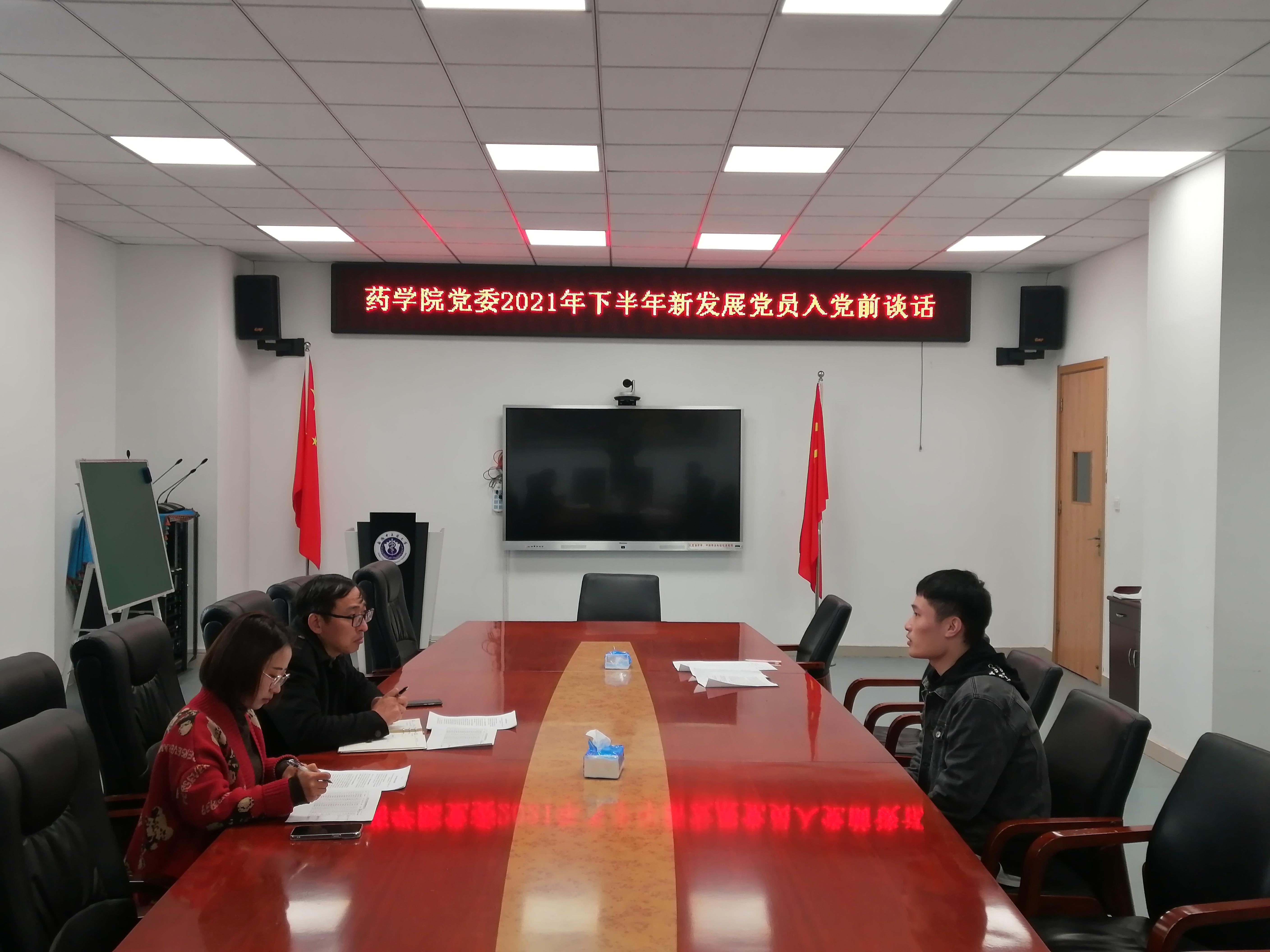 药学院党委副书记、院长桂双英询问了新发展党员党的性质与宗旨、党员权利与义务、党史知识等内容。并在谈话中强调,作为大学生党员要以更高标准严格要求自己,除了要努力学习科学文化知识,更要注重提高自身理论修养,认真学习习近平总书记系列重要讲话精神,用实际行动践行入党誓词。
