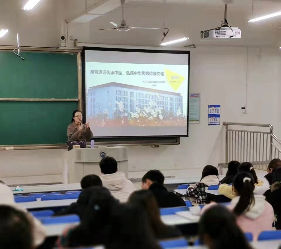 为响应国家大力推广普通话的政策号召,宣传第24届全国推广普通话宣传周“普通话诵百年伟业,规范字写时代新篇”的主题,12月8日晚上,人文与国际教育交流学院举办题为“用普通话传承中医,弘扬中华优秀传统文化”的普通话培训与测试讲座活动。本次讲座由安徽省普通话水平测试员金海蒂老师主讲,21级汉语国际教育专业学生和我校其他专业学生参加本次活动。