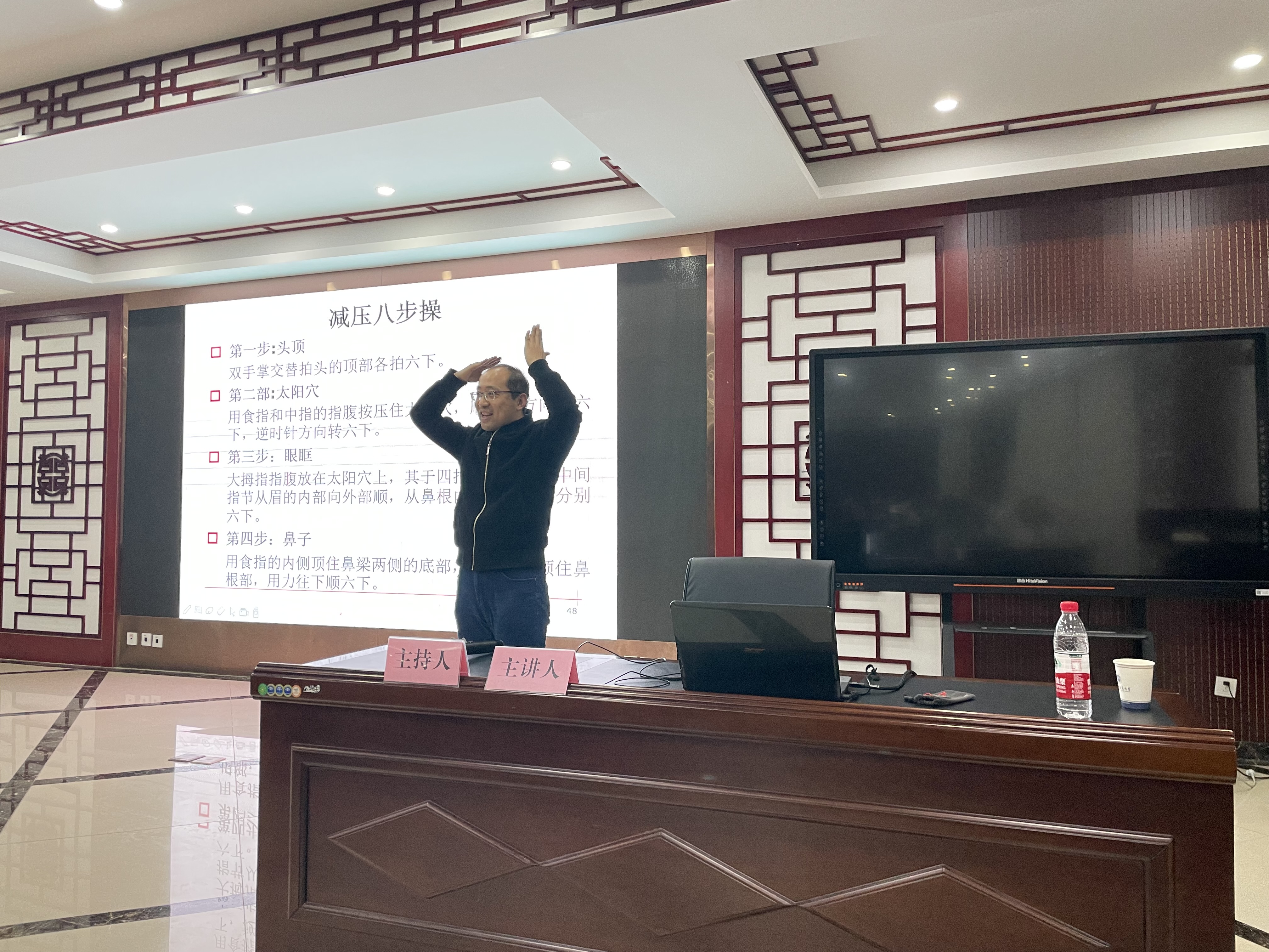 张俊杰从大学生考试周遇到的压力与焦虑出发,解析压力表现和压力原因,同时提出应对考试焦虑的方法,通过认知调整,降低对“未知”的不确定感,提升心理韧性等方法调整不合理信念,减轻焦虑情绪。讲座过程中,同学们积极参与互动,现场体验简单的放松训练—蝴蝶拍、减压八步操,让同学们从考前焦虑紧张的情绪状态中释放出来,获得身心放松。