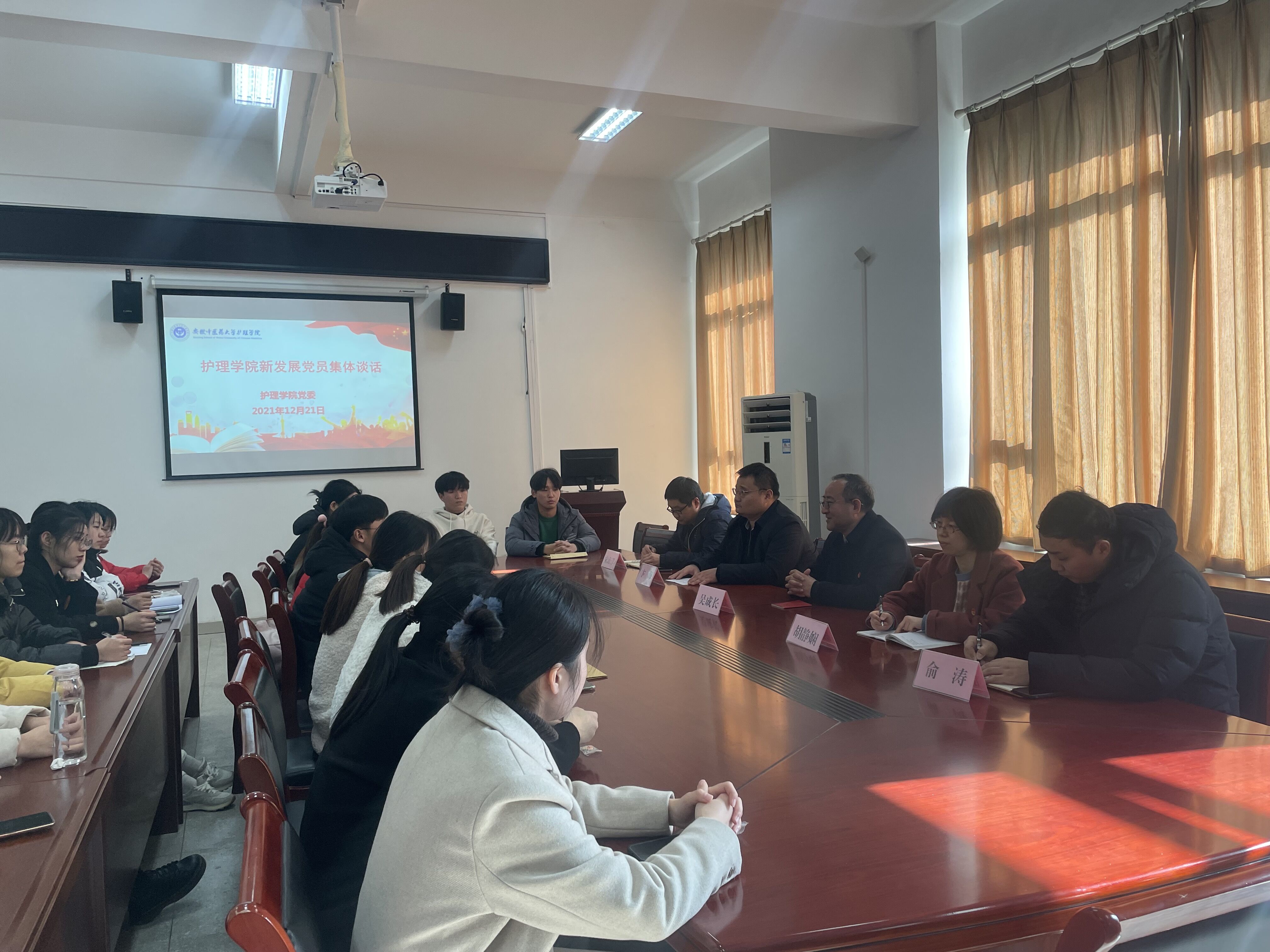 为加强对青年一代党员的教育和培养工作,增强新党员的荣誉感和责任感,激励他们自觉践行初心使命,增强党性意识,12月21日中午,护理学院党委开展新发展党员集体谈话暨入党宣誓仪式。护理学院党委书记吴成长、副书记卞海、各学生支部书记及全体新发展党员参加会议。会议由卞海主持。