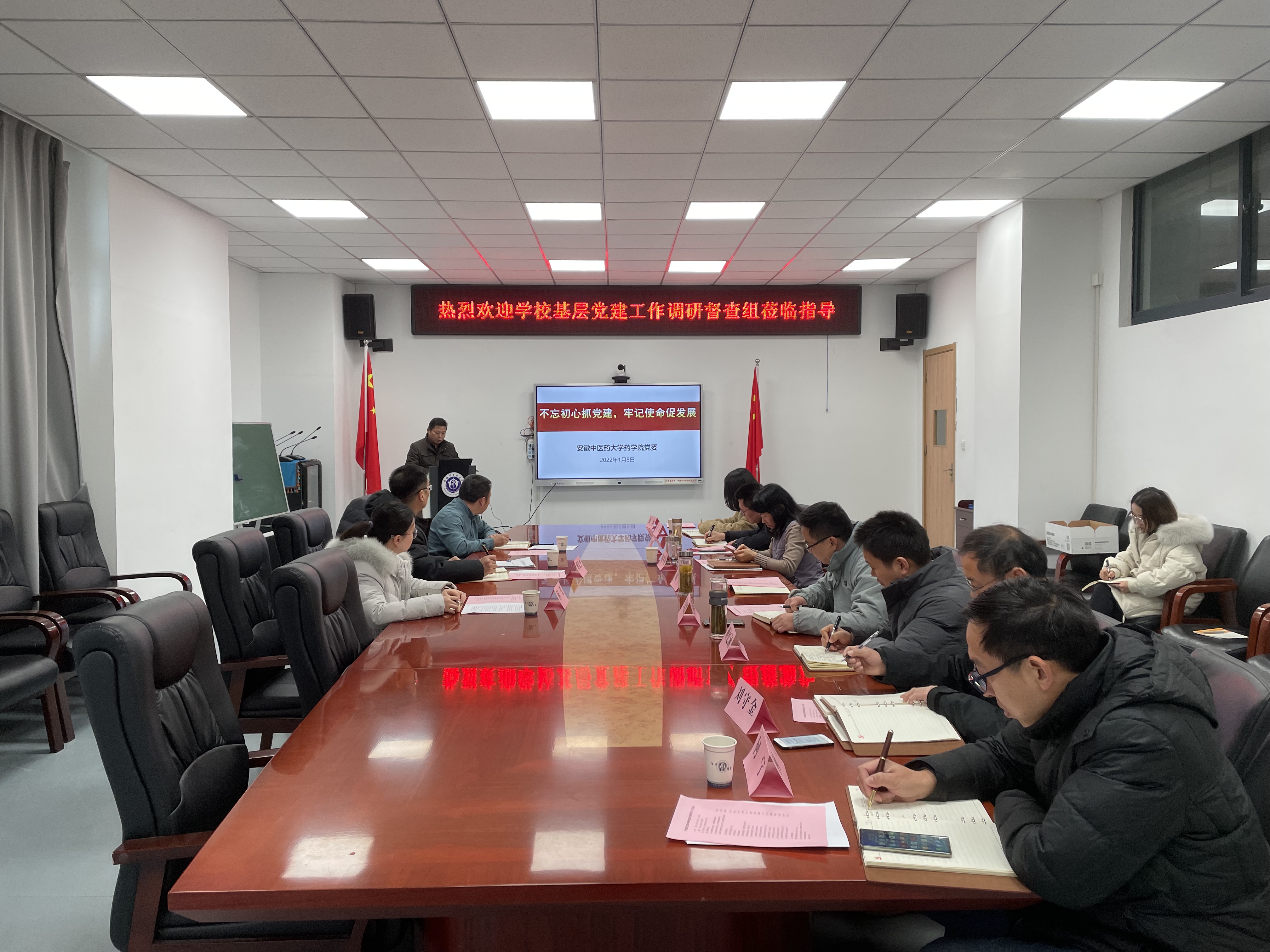 为深入学习宣传贯彻党的十九届六中全会精神,进一步加强基层党组织建设,夯实基层党建工作责任,不断提升基层党建工作质量,按照学校党委统一部署,1月7日上午,针灸推拿学院党委书记、第四调研督查组组长蒋宏杰一行对药学院基层党建工作开展调研督查。药学院党政领导班子成员、党委委员、各党支部书记参会,会议由药学院党委书记胡卿主持。