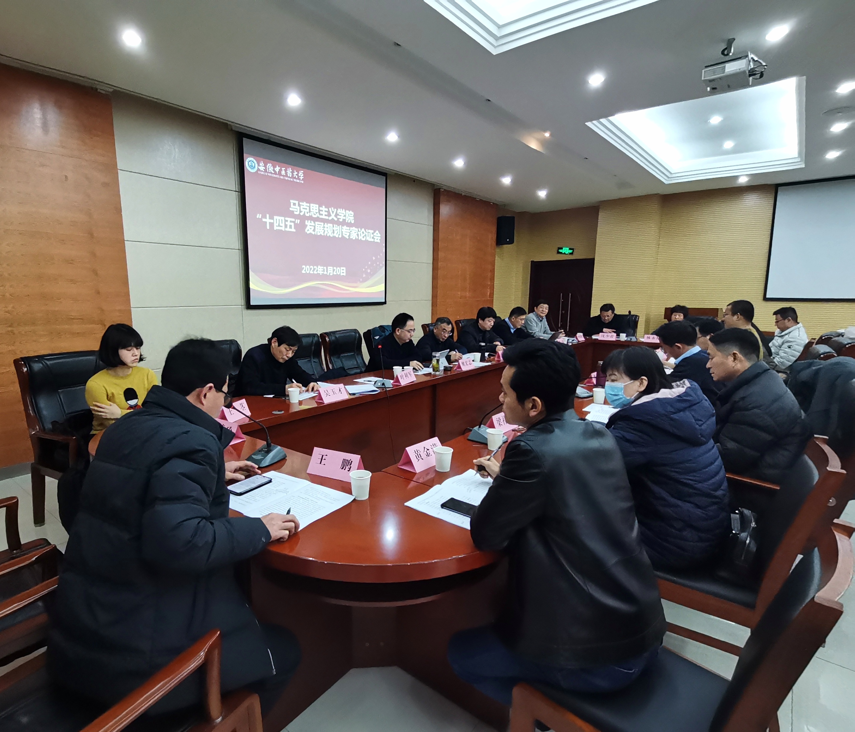 1月20日,马克思主义学院在梅山路校区新安楼一楼会议室召开“十四五”发展规划专家论证会。邀请湖南中医药大学叶利军教授、安徽师范大学姚宏志教授、安徽财经大学张斌教授、淮南师范学院吴玉才教授,学校党委书记王先俊,学校党委常委、人事处处长聂久胜,发展规划处处长申国明,科技处处长吴德玲,研究生院院长王鹏,财务处处长林永格,总务处处长沈少蕾,教务处副处长张艳春参与论证指导,马克思主义学院党政领导和各教研室主任参加论证会。学院党总支书记黄学武主持会议。