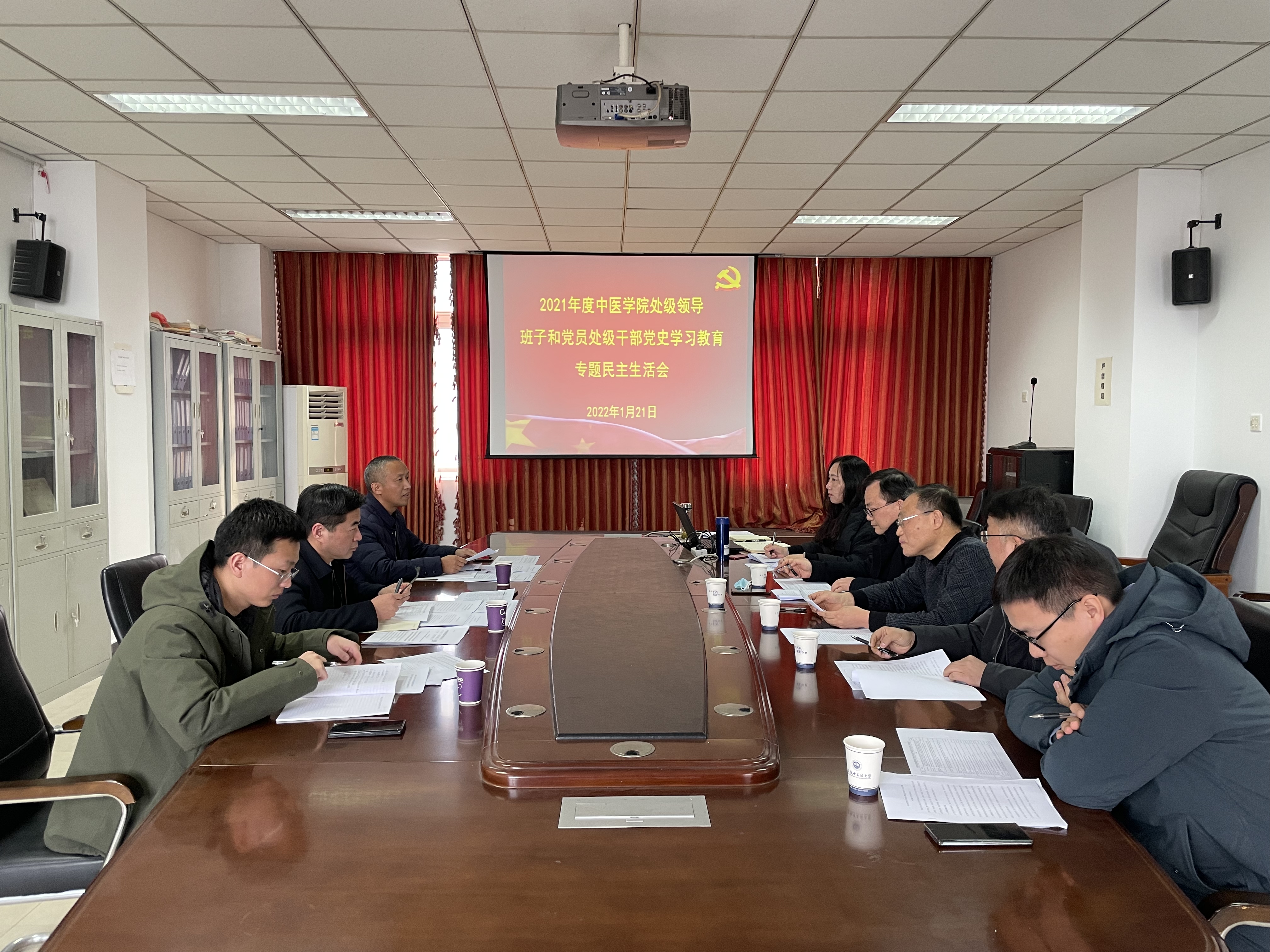 1月21日下午,中医学院党委召开2021年度处级领导班子和党员处级干部党史学习教育专题民主生活会,学校党委常委、组织部部长、校党史学习教育专题民主生活会第十指导组组长武刚率队到会指导,中医学院党政领导班子参会,会议由学院党委书记杜明主持。