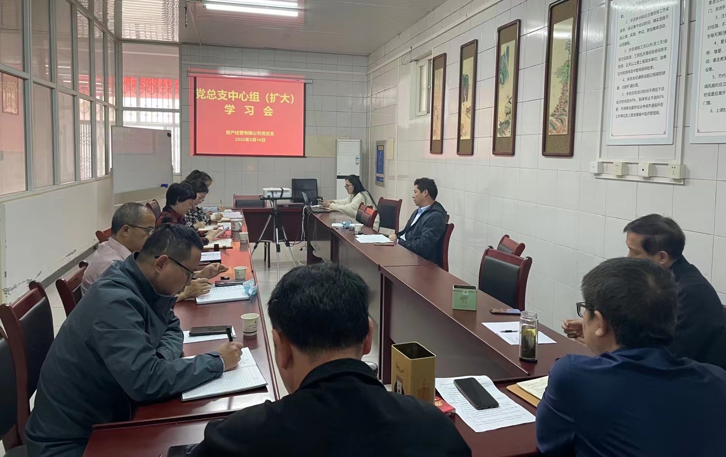 3月14日上午,资产经营有限公司在史河路会议室召开2022年第3次党总支中心组(扩大)学习会。会议由资产公司党总支书记张亚辉主持,公司高级顾问、党总支委员、公司副总级领导参加本次学习会。