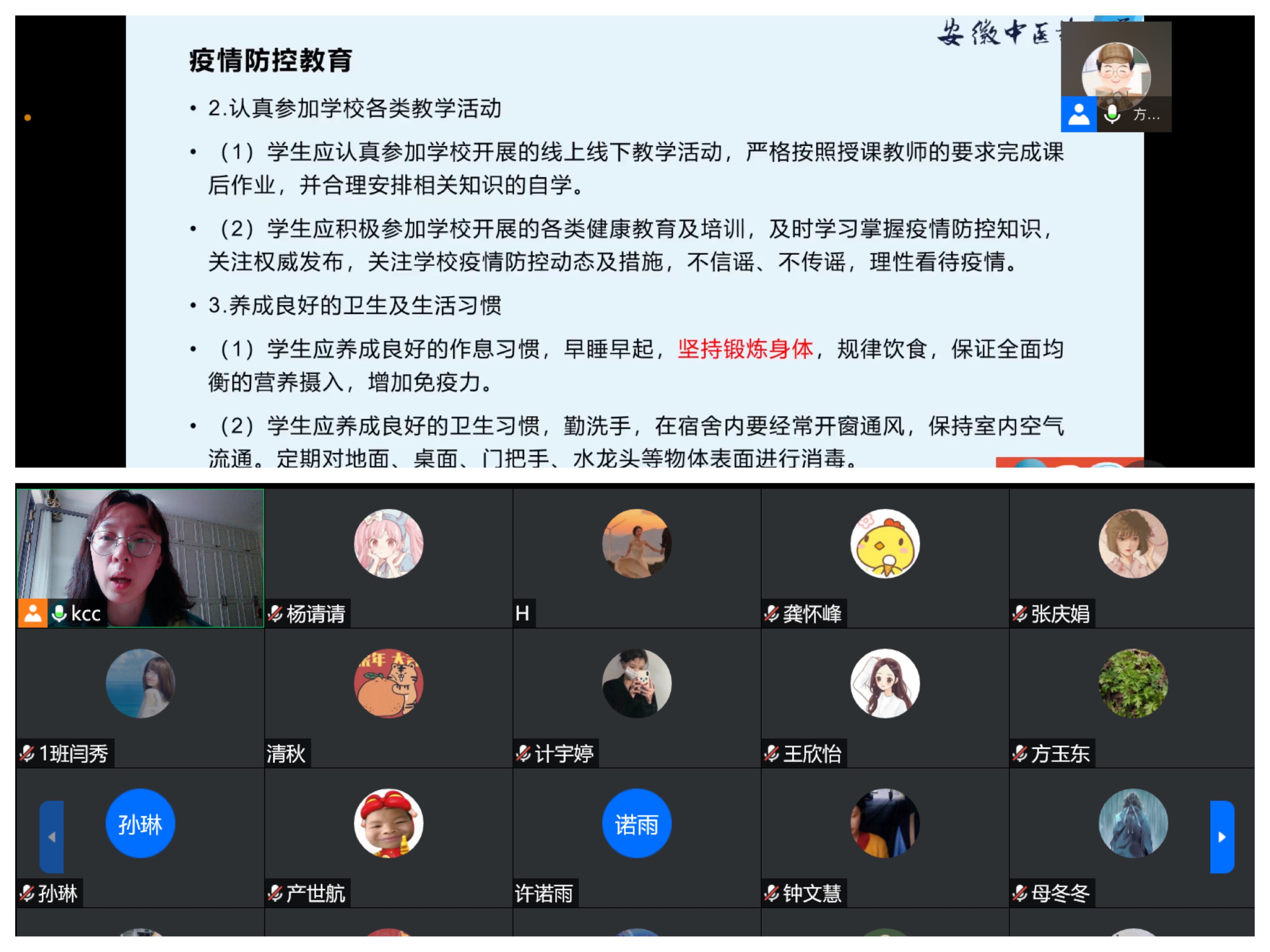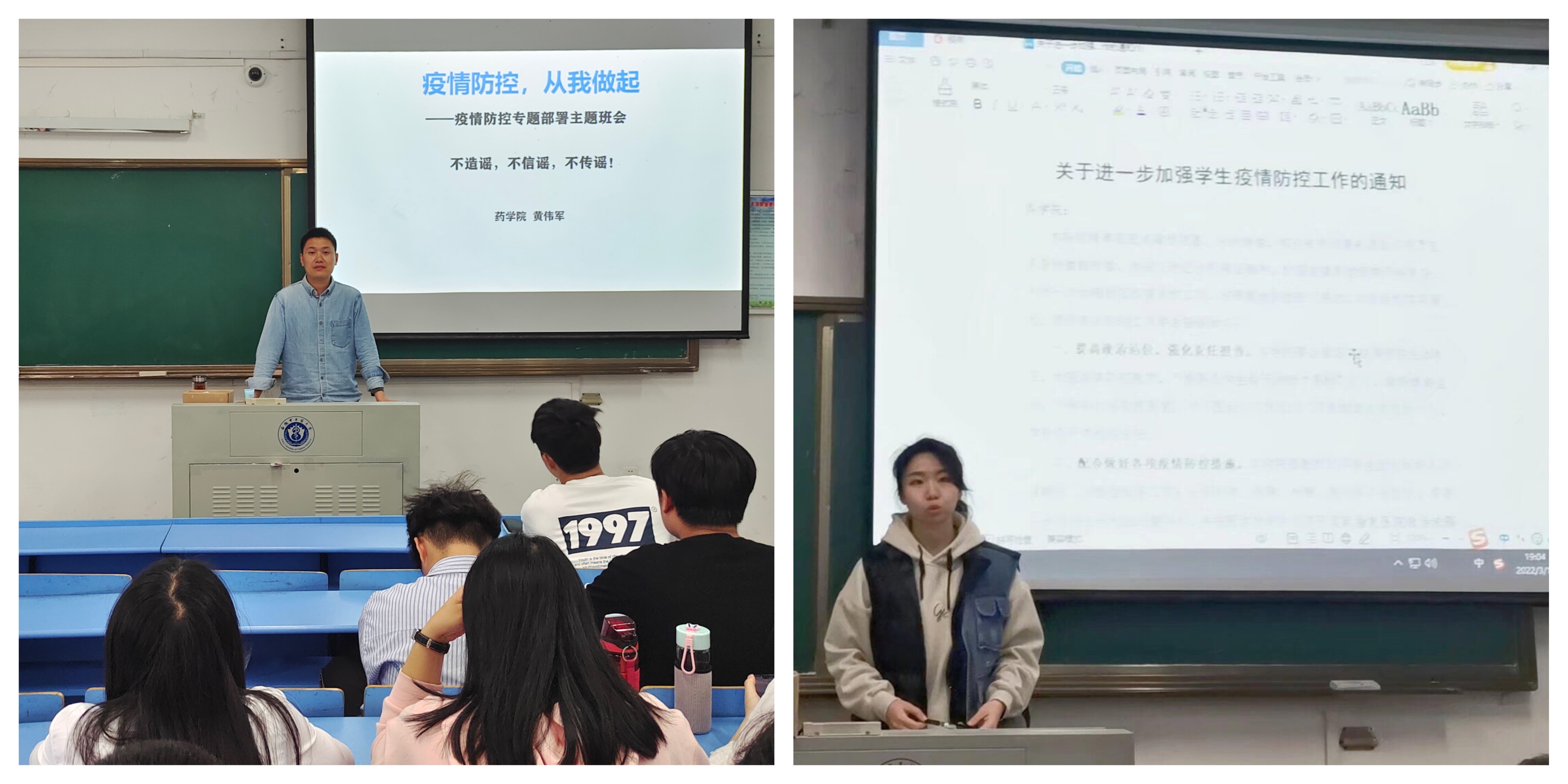 近日疫情形势严峻,为进一步加强校园疫情防控工作,药学院辅导员根据学校工作要求和班级实际情况,利用线上或线下平台召开了疫情防控主题班会。