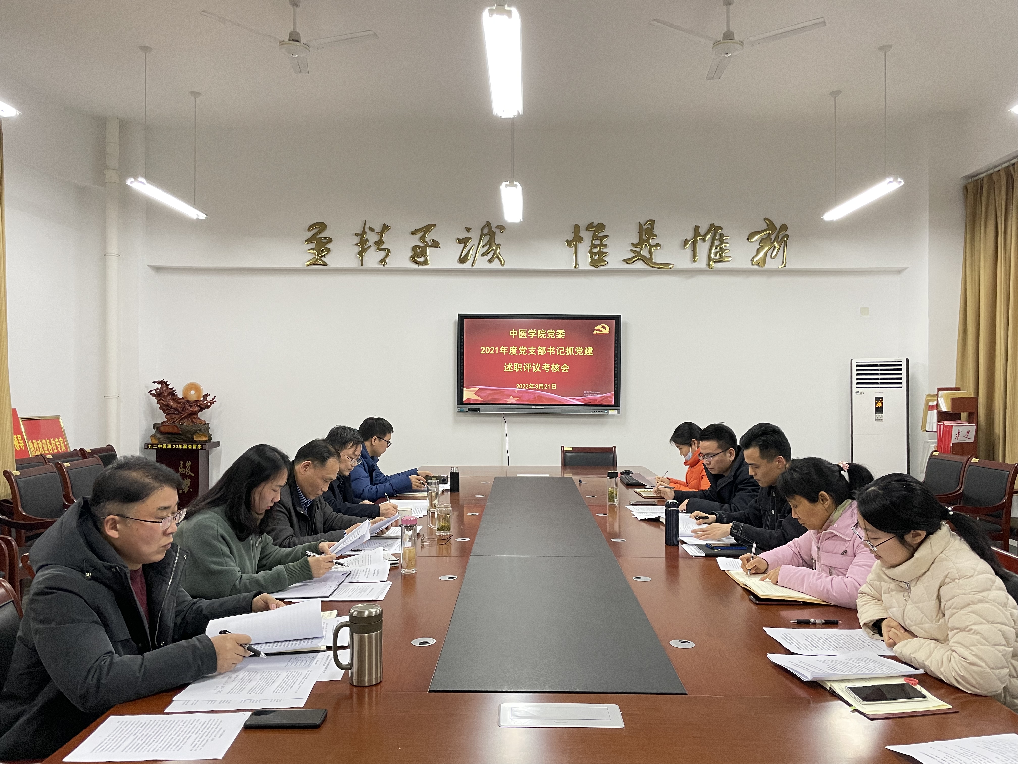3月21日下午,中医学院党委在学院A301会议室召开2021年度党支部书记抓党建工作述职评议考核会议,中医学院党委委员、各党支部书记及部分党员同志参加会议,会议由党委书记杜明主持。