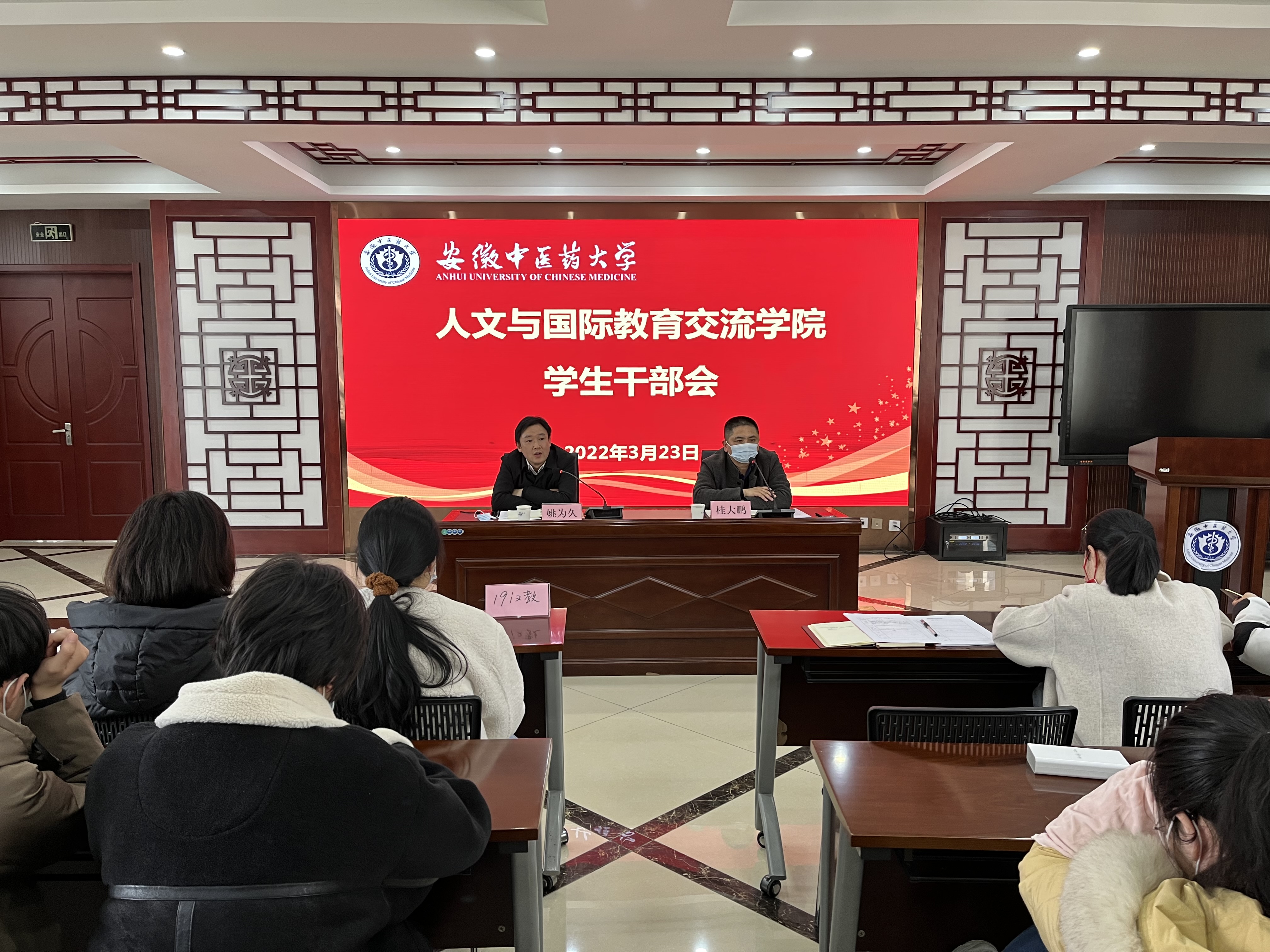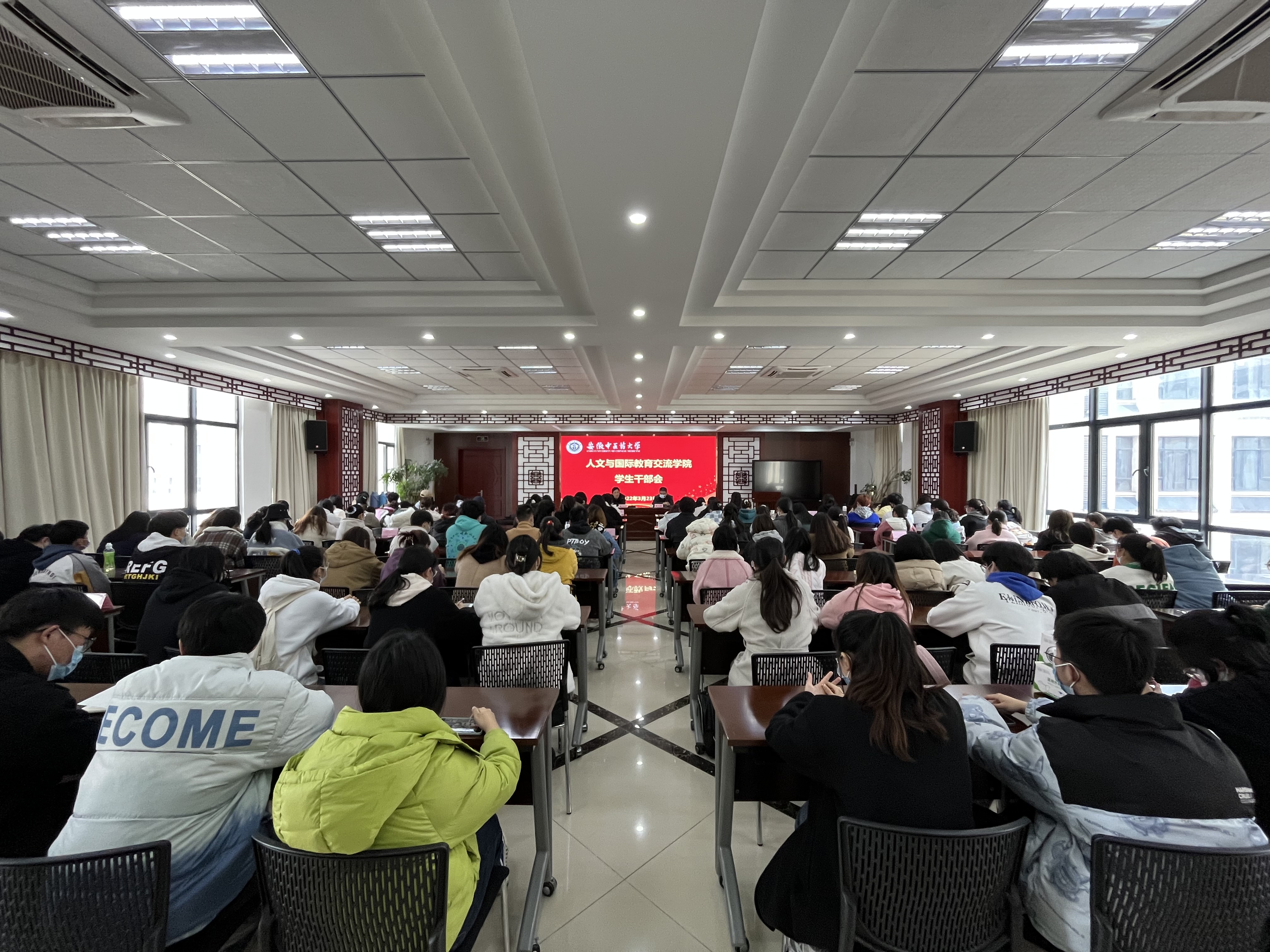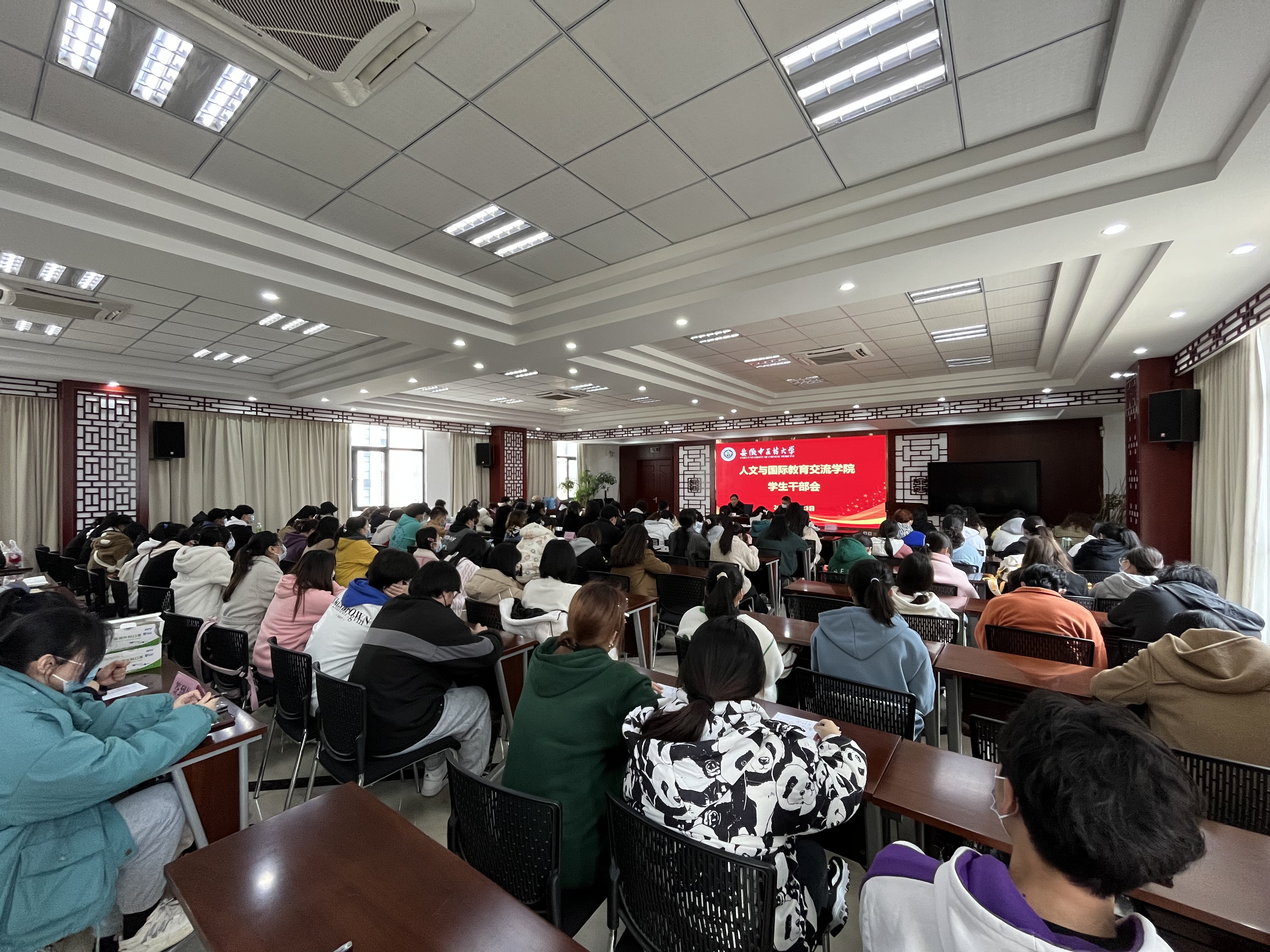 3月23日中午,人文与国际教育交流学院在惟新楼380沁馨堂召开全体学生干部大会,学院党总支书记姚为久、副书记、全体辅导员、各班级主要学生干部、寝室长参加会议。