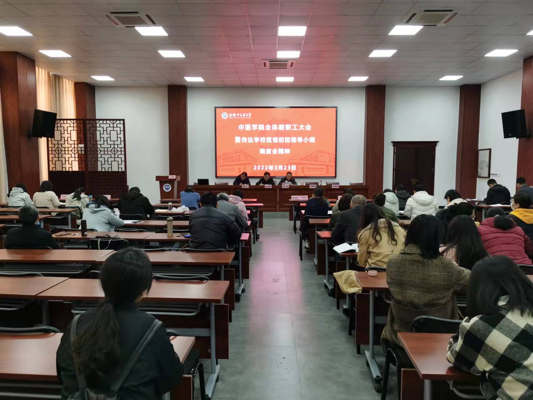 3月23日下午,中医学院召开全体教职大会暨传达学校疫情防控领导小组调度会精神,学院党政领导及全体教职工参加本次会议,会议由学院党委书记杜明主持。