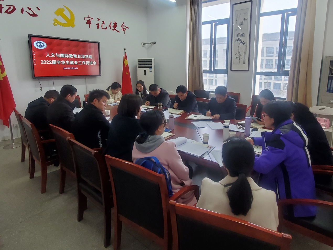 为全面推进学院毕业生就业工作,3月23日下午,人文与国际教育交流学院召开2022届毕业生就业工作促进会,学院党政领导班子,党支部书记、各系正副主任,实习就业办秘书以及全体辅导员出席了此次会议。