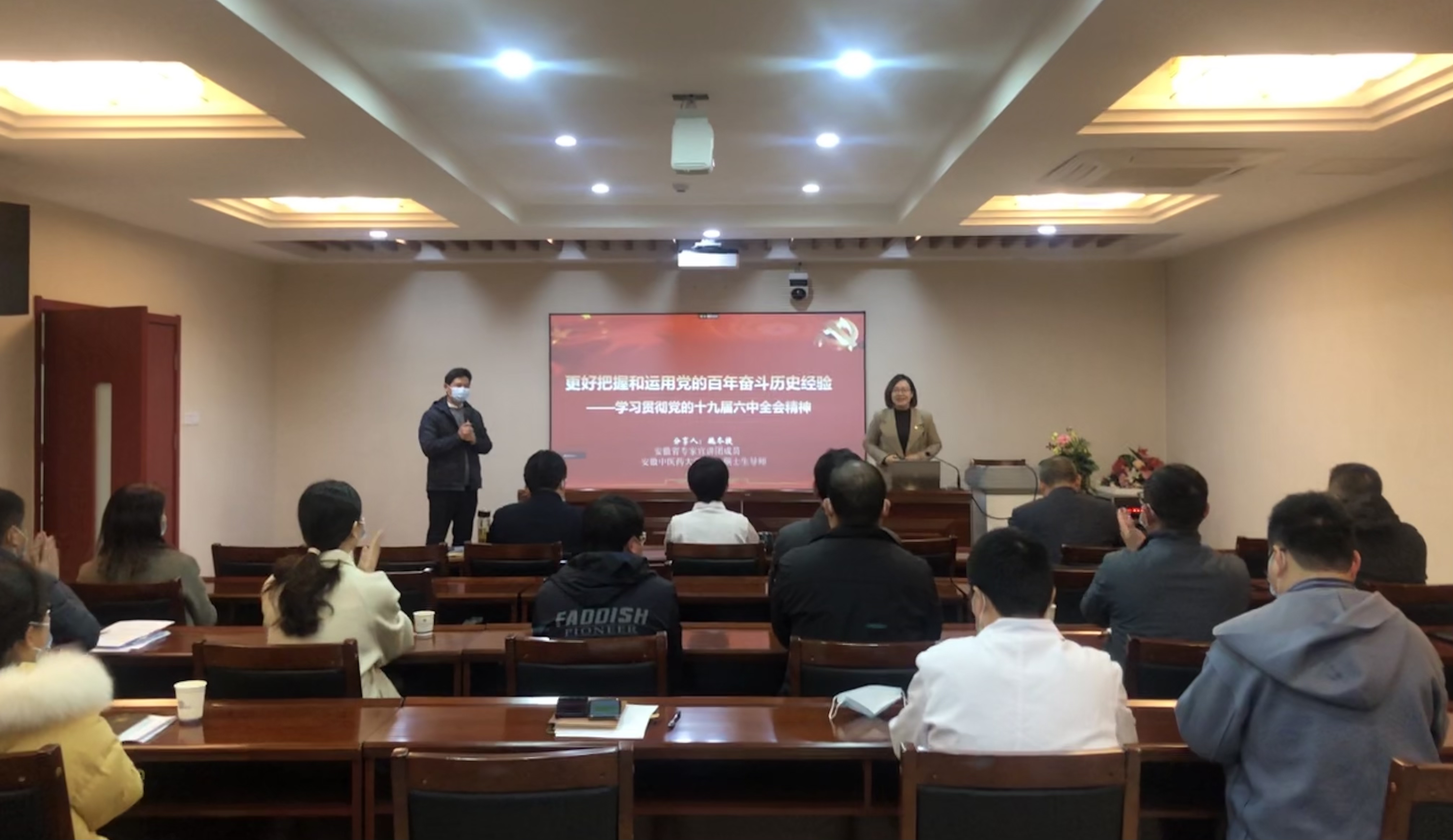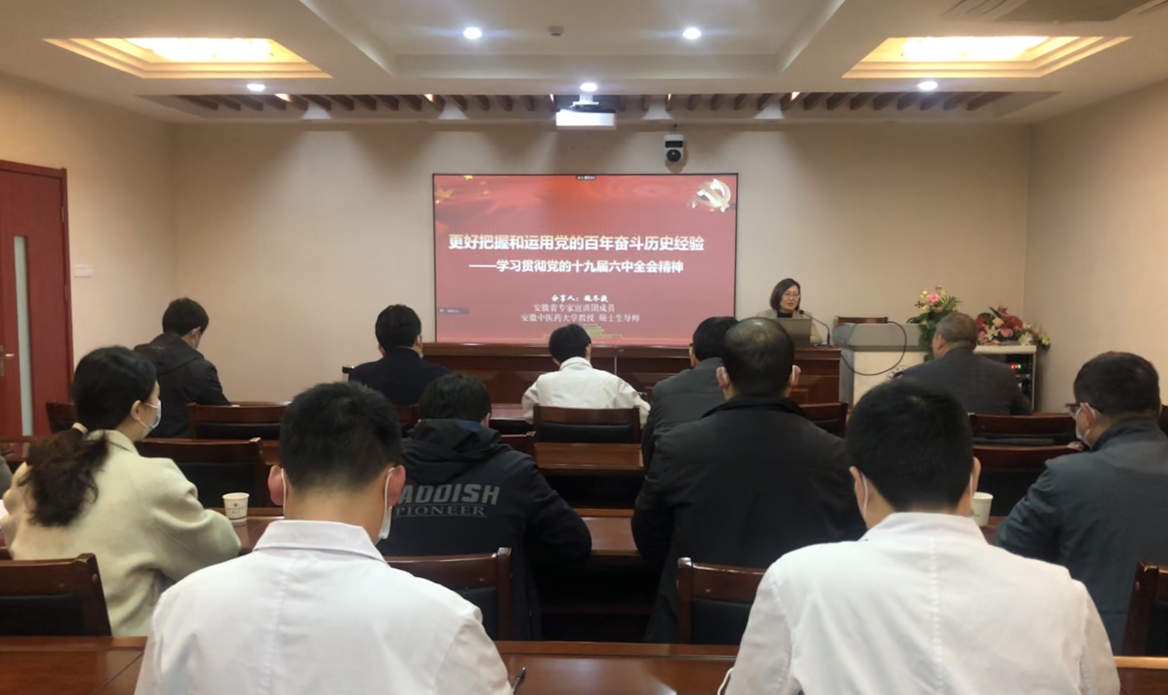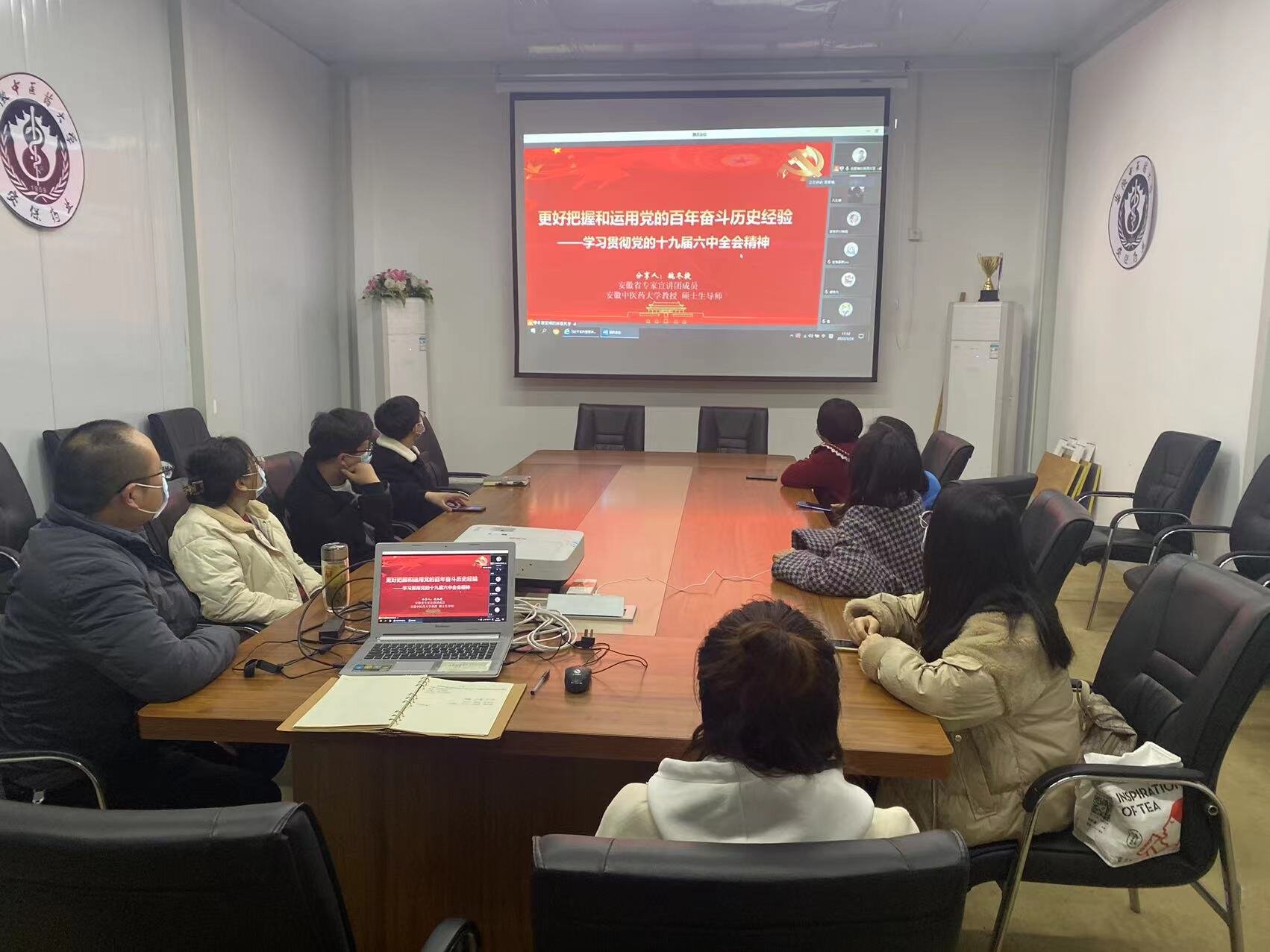 为继续深入学习宣传贯彻党的十九届六中全会精神,引导党员干部把思想和行动统一到全会精神上来,3月24日晚,资产经营有限公司在花园街国医堂三楼会议室召开2022年“企业党建大讲堂”第一讲,特邀学校马克思主义学院教授魏冬捷作《更好把握和运用党的百年奋斗历史经验——学习贯彻党的十九届六中全会精神》专题宣讲会。受疫情影响,本次宣讲会采取线上网络直播与线下会场宣讲相结合的方式进行,公司领导班子成员、党总支委员、中层及以上干部、全体党员和入党积极分子参与了本次学习。本次会议由公司党总支书记、董事长张亚辉主持。
