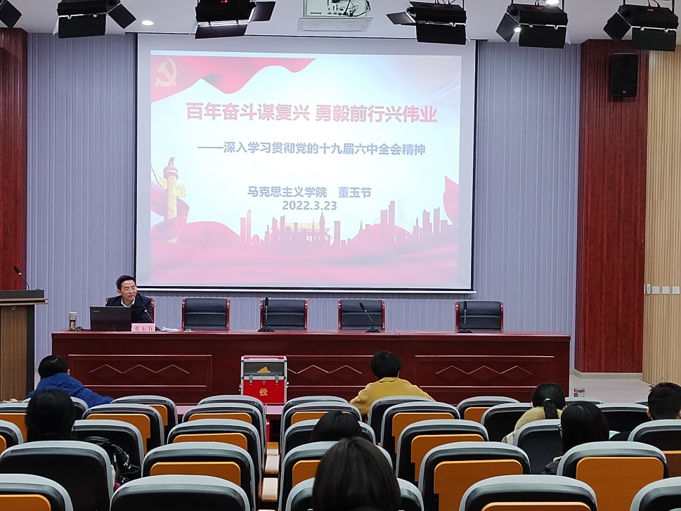 为全面深入学习领会党的十九届六中全会精神,准确把握丰富内涵和实践要求,切实引导学院党员干部把思想和行动统一到党的十九届六中全会精神上来,根据学校要求,3月23日下午,中西医结合学院党委邀请安徽省委讲师团专家库成员、马克思主义学院院长董玉节教授作专题报告,学院全体教职工参加,会议由该院党委书记尹必武主持。
