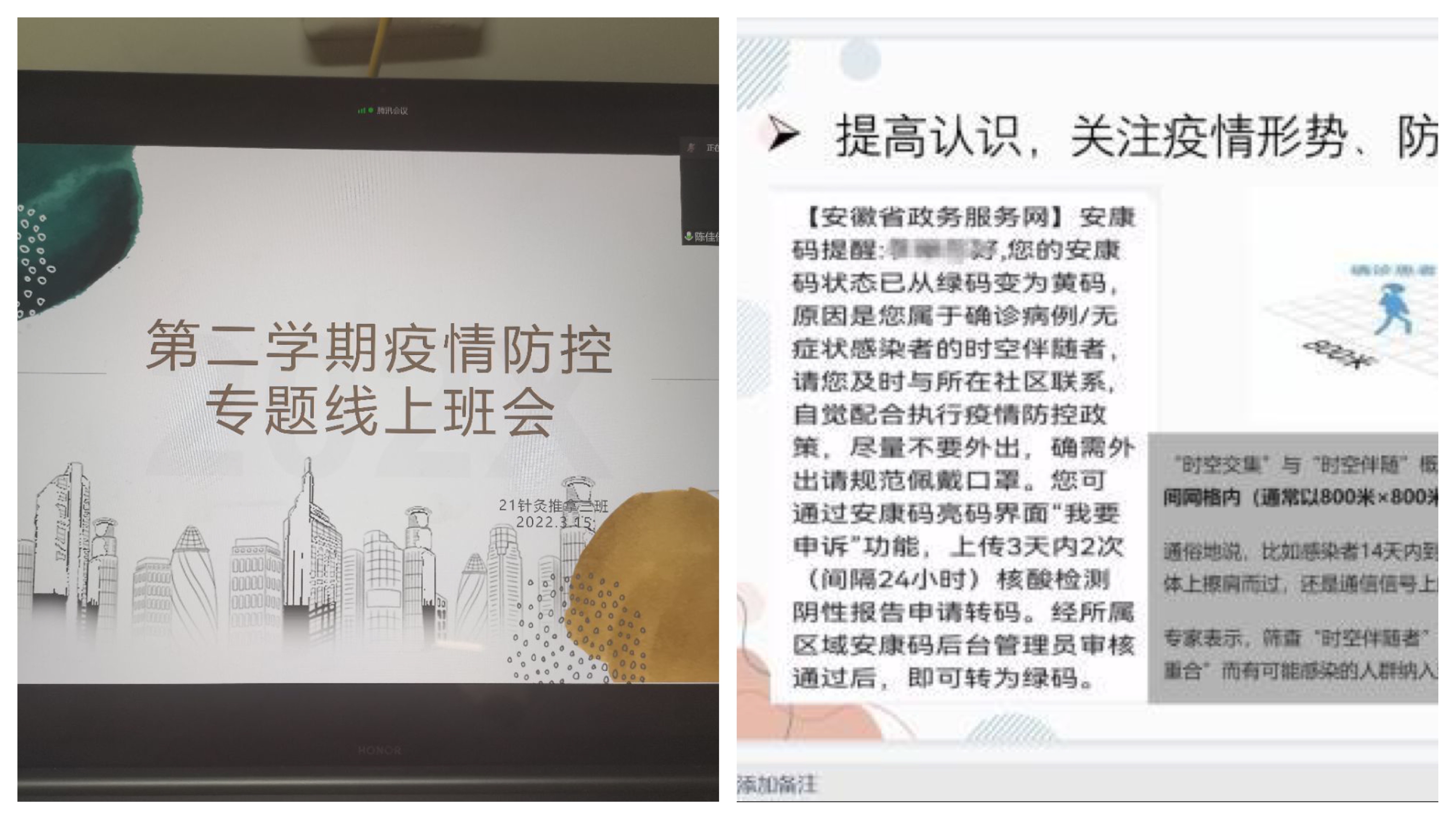 开好主题班会,做科学防控的宣传员。辅导员们立足各年级学生特点和工作重点,通过线上、线下主题班会向学生系统传达了学校疫情防控的工作部署和要求,宣讲了疫情防控措施与知识,要求大家增强责任意识和防护意识,同时加强对学生的心理关怀,引导大家用积极的心态面对疫情,养成良好的卫生习惯,共同为疫情防控助力。