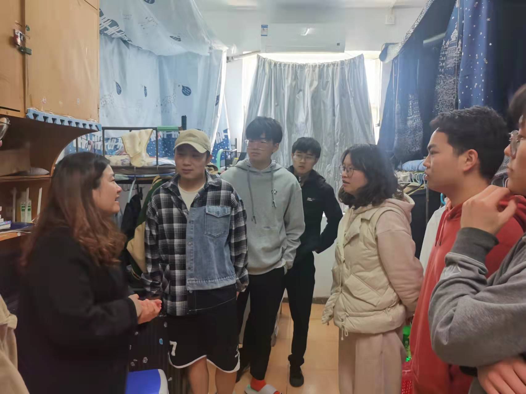 深入学生宿舍,做校园封控的监督员。为把疫情防控期间学生宿舍管理工作落到实处,提高学校宿舍管理工作的有效性,针灸推拿学院辅导员深入学生宿舍,了解同学们的学习、心理和生活状况,并开展宿舍防疫工作检查和防疫知识宣传。强调宿舍的整洁和卫生、寝室通风、校园封闭管理等问题,提醒大家要多通风、勤洗手,在公共场合佩戴口罩;同时特别提醒同学们线上学习更要自律,更要讲方法、讲效率。