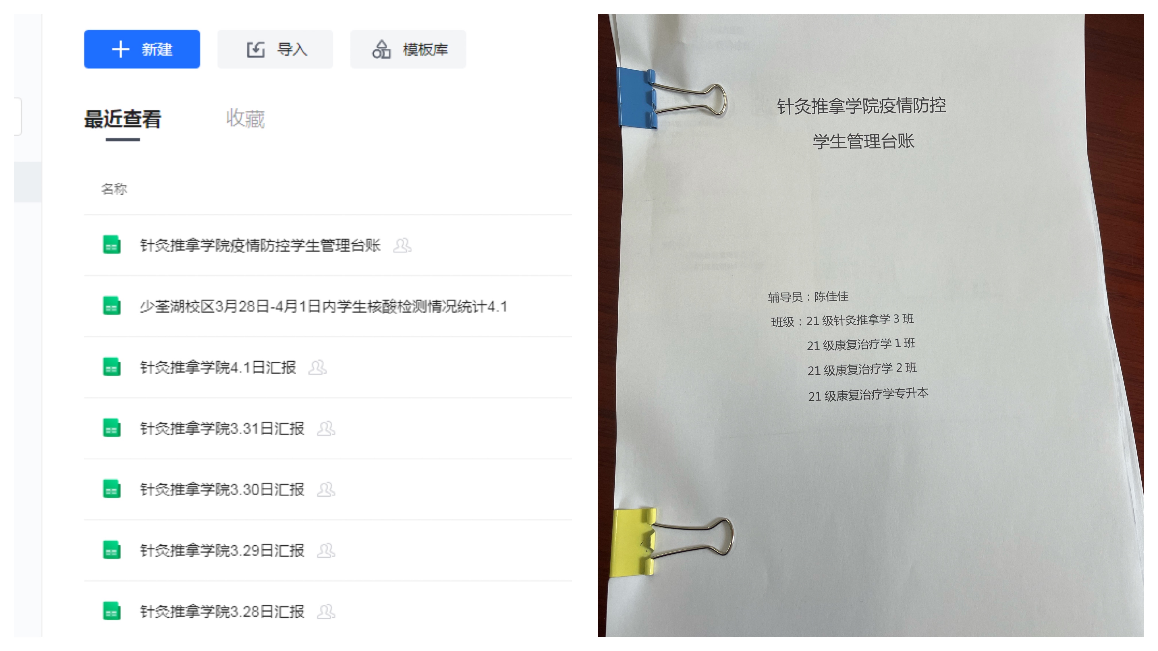 建立防疫台账,做精准防控的记录员。为了扎实履行疫情防控主体责任,保证疫情监测、排查、预警、防控等工作不落一人,针灸推拿学院建立了《疫情防控学生管理台账》,涵盖学生请假信息、安康码异常学生信息、离肥返肥登记信息、发热咳嗽等症状处理跟进信息等,每日督促学生通过“易班”进行体温监测,完善“日汇报”登记,提高疫情防控的精准性和有效性。