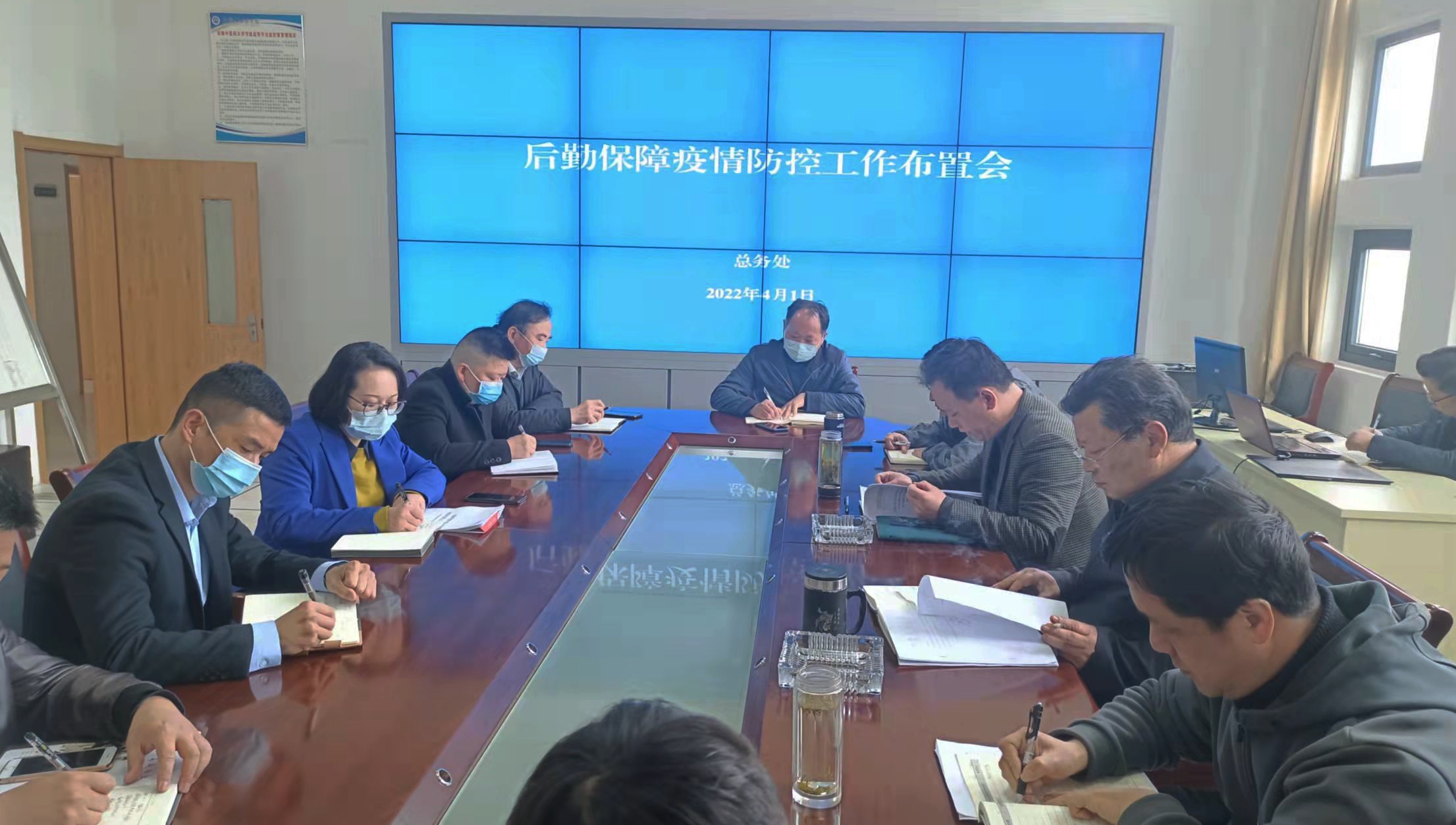 2022年4月1日上午9:30,总务处召开了后勤保障疫情防控工作布置会,处长沈少蕾到会并作指导讲话,副处长和在校第三方服务单位(餐饮企业、物业公司、电梯维保、绿化维护、商超)负责人和相关科室负责人参加了会议。